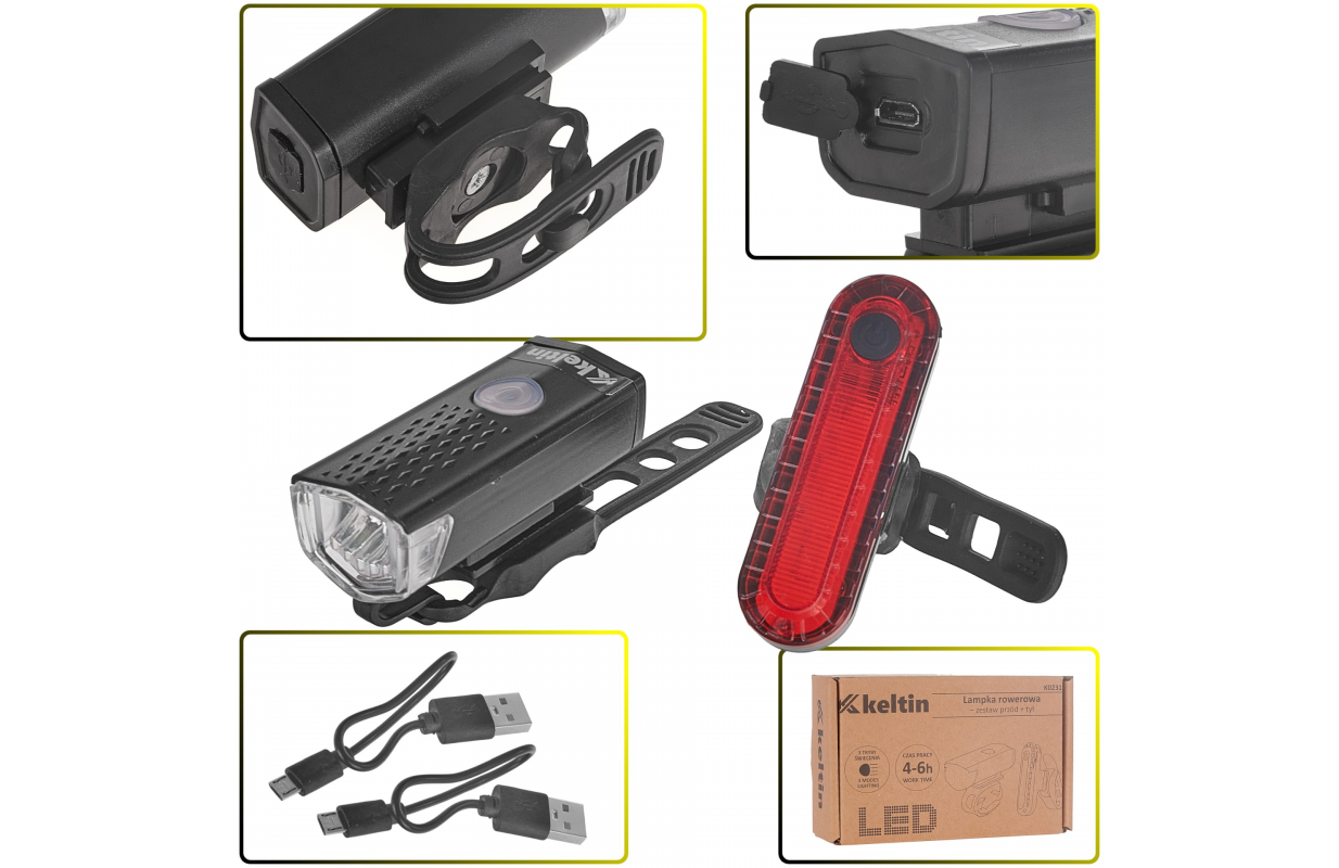 Komplekta saturs: priekšējais + aizmugurējais lukturis, 2x mikro USB kabelis