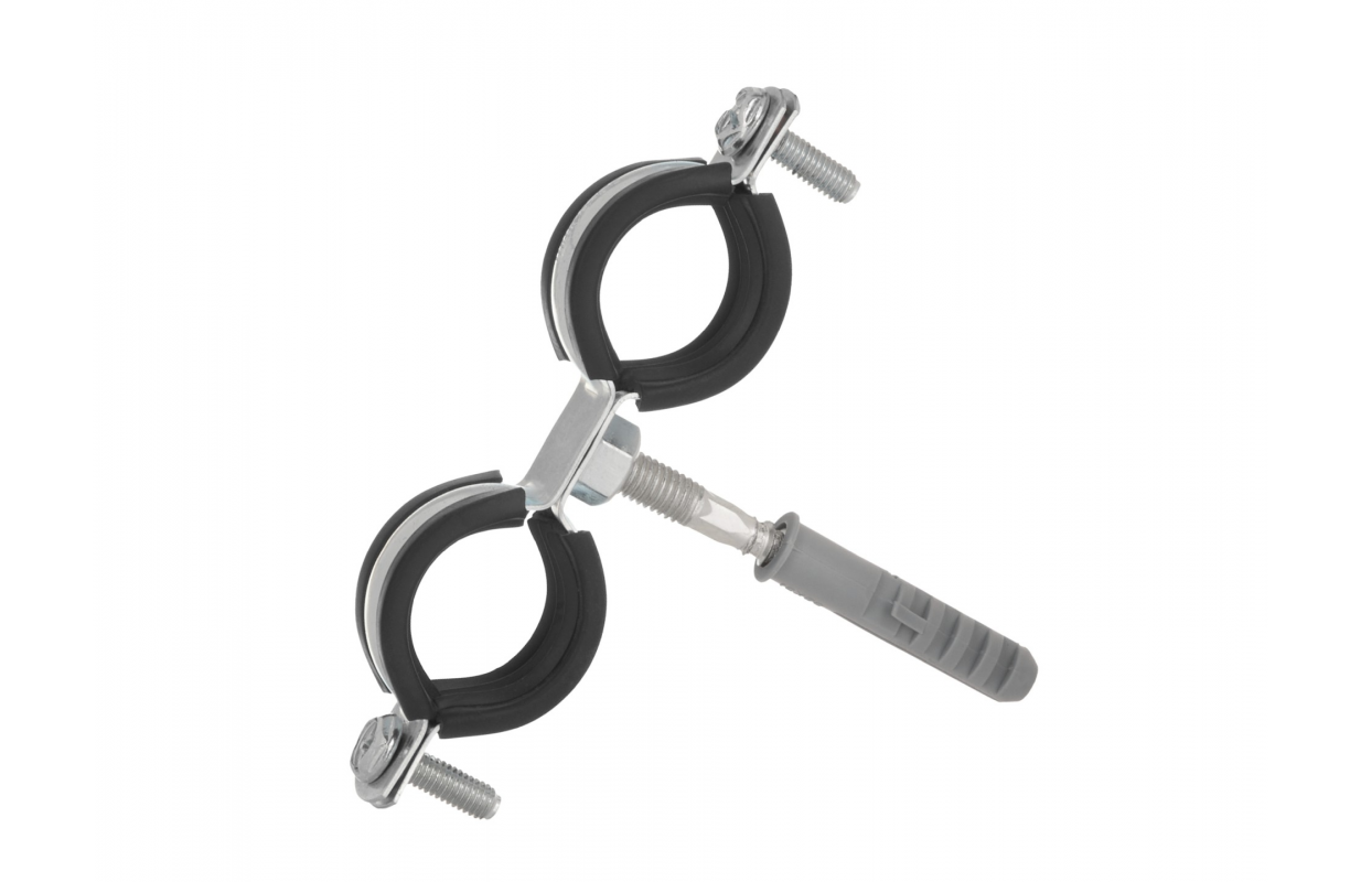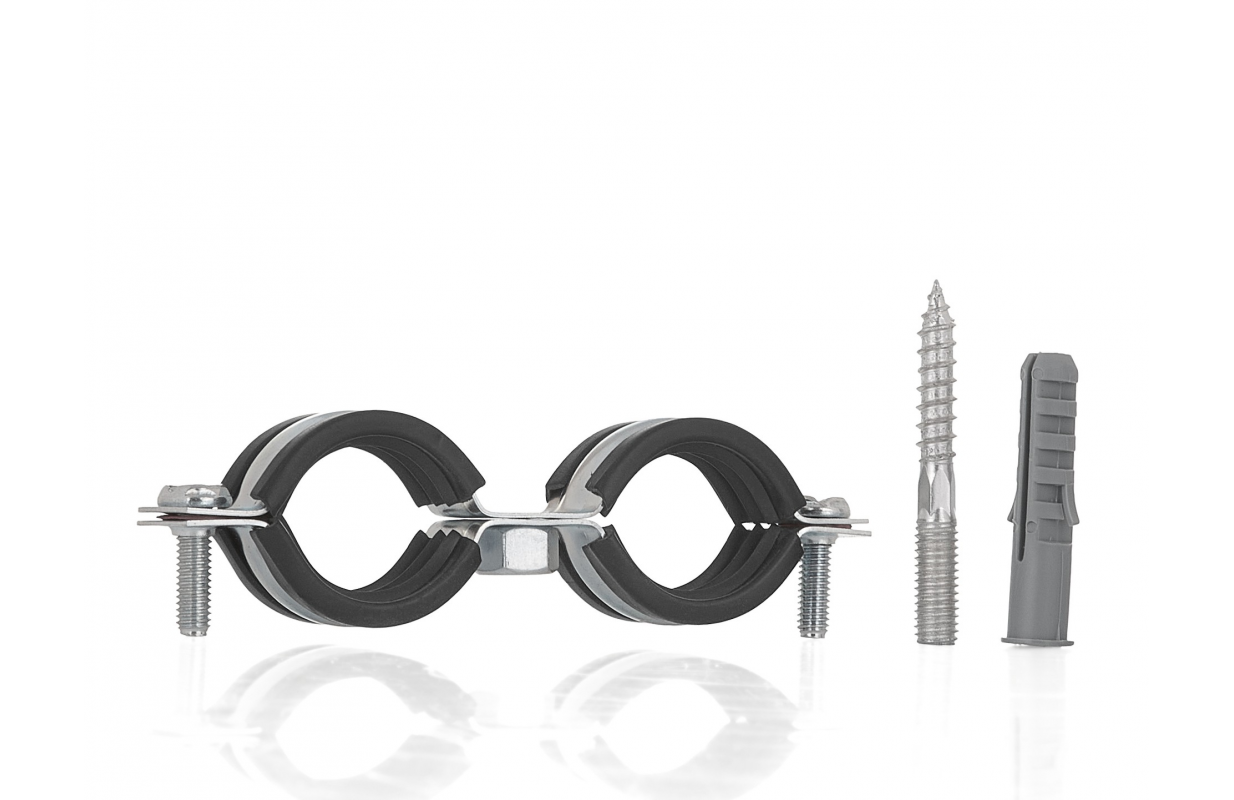 Dubultā metāla skava ar gumiju ir paredzēta cauruļu nostiprināšanai santehnikas, apkures vai gāzes iekārtās. Tas nodrošina stabilitāti, aizsargā caurules un samazina vibrāciju ietekmi uz visu sistēmu.
