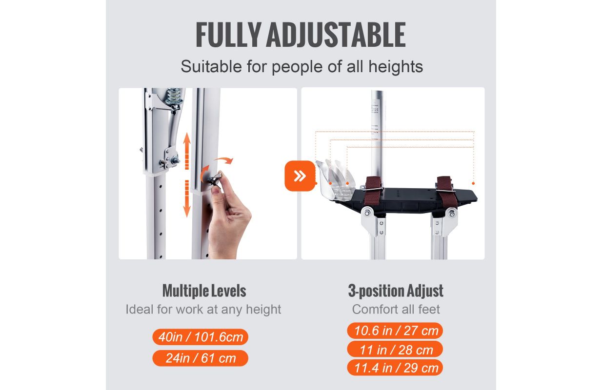 • Iestatiet perfektu augstumu: Vai esat noguris no ierobežojumiem? Pielāgojieties jebkuram izaicinājumam bez piepūles! Izmantojot skrūves, jūs iegūstat vieglu augstuma regulēšanu no 61 līdz 101 cm, lai apmierinātu dažādas darba vajadzības. Turklāt, pateicoties 3 pozīciju papēža kronšteina dizainam, mūsu alumīnija pāļi ir piemēroti lielākajai daļai pēdu izmēru no 27 līdz 29 cm, nodrošinot ērtu lietošanu lielākajai daļai lietotāju.