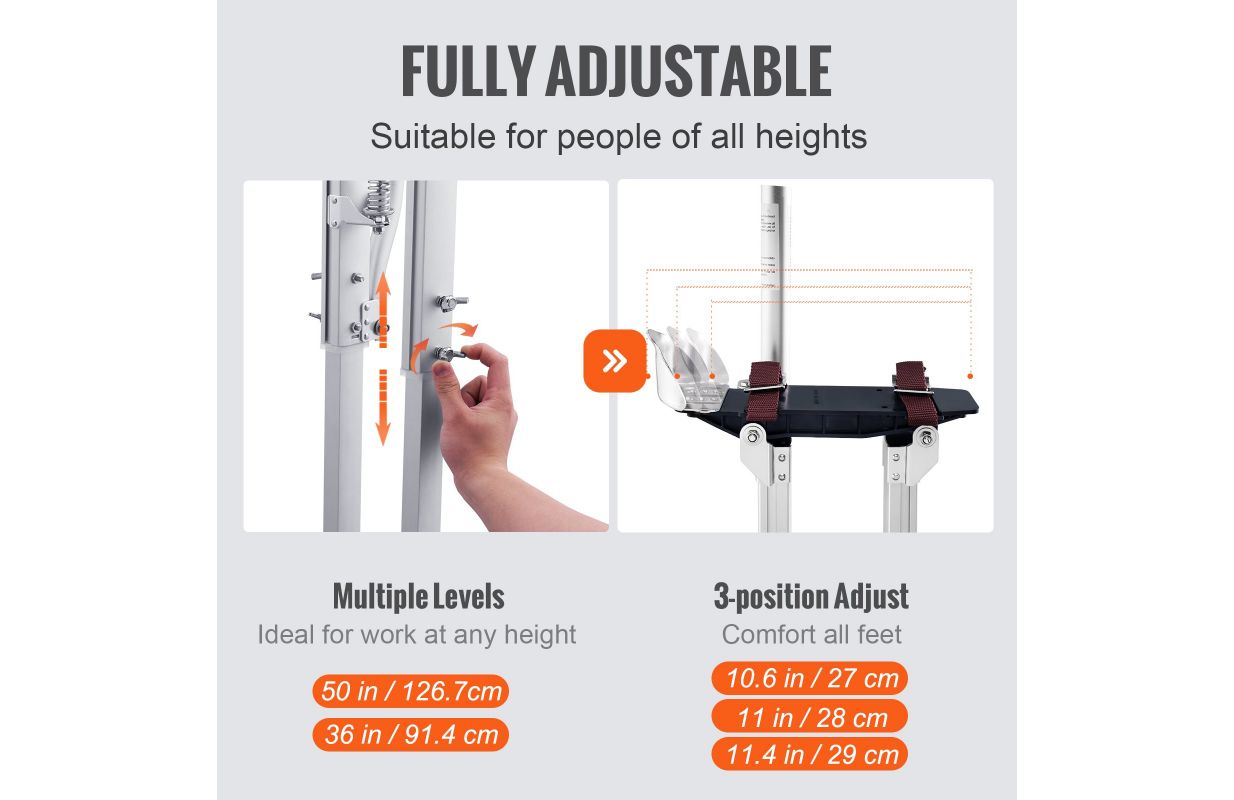 • Iestatiet perfektu augstumu: Vai esat noguris no ierobežojumiem? Pielāgojieties jebkuram izaicinājumam bez piepūles! Ar skrūvēm jūs varat viegli pielāgot augstumu no 91 līdz 126 cm, lai tas atbilstu dažādām darba vajadzībām. Turklāt, pateicoties 3 pozīciju papēža kronšteina dizainam, mūsu alumīnija pāļi ir piemēroti lielākajai daļai pēdu izmēru no 27 līdz 29 cm, nodrošinot ērtu lietošanu lielākajai daļai lietotāju.