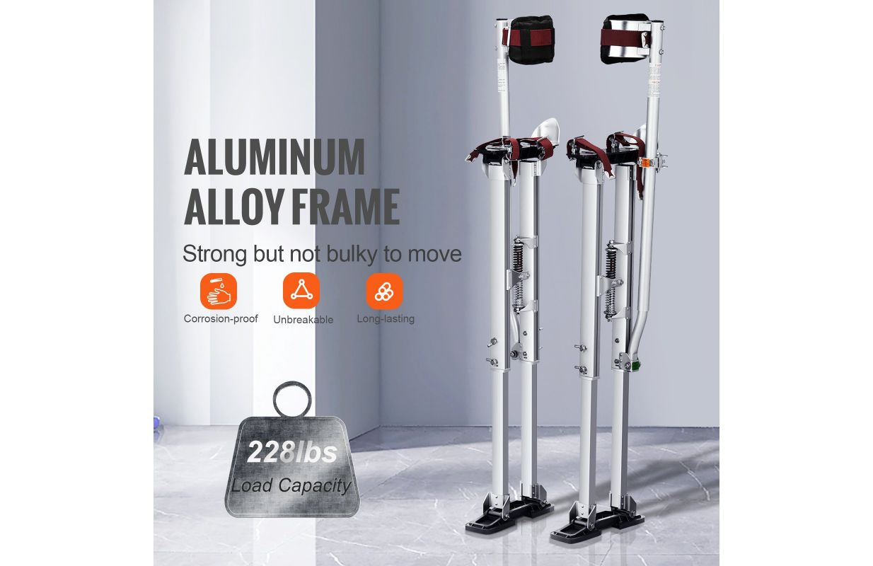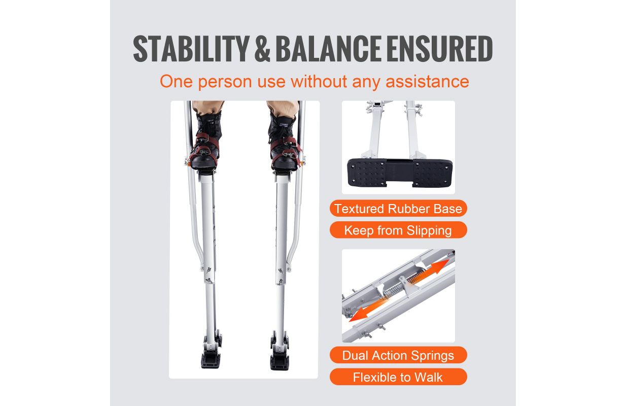 • Stabilitāte pār pārējo: Papildus izturīgām neilona siksnām, kas nodrošina jūsu drošību, drywall statņiem ir arī divas triecienu absorbējošas atsperes, lai saglabātu līdzsvaru staigājot, lai jūs varētu viegli stāvēt atsevišķi. Stilts dos jums priekšrocības jūsu nākamajā lielajā projektā; Apakšējās gumijas pamatnes palielina berzi uz zemes, lai izvairītos no slīdēšanas un skrāpējumiem.