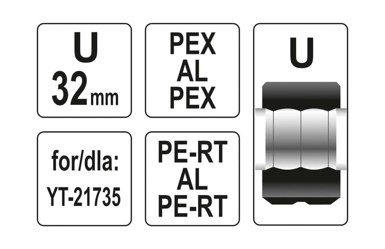 Rezerves U veida matrica YT-21735 presei. Izmanto 32 mm diametra U veida savienojumu presēšanai uz PEX-AL-PEX vai PERT-AL-PERT caurulēm.
