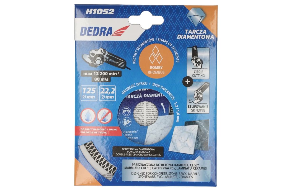 DEDRAS H1052 dimanta griešanas disks ar romba formas segmentiem ir paredzēts gan mitram, gan sausam griešanai, efektīvi apstrādājot dažādus materiālus.