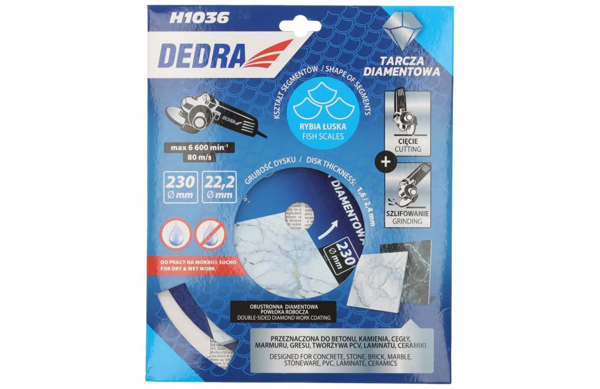 DEDRA H1036 dimanta disks ar zvīņveida segmentiem ir paredzēts mitrai un sausai griešanai, lieliski tiek galā ar dažādu materiālu apstrādi.