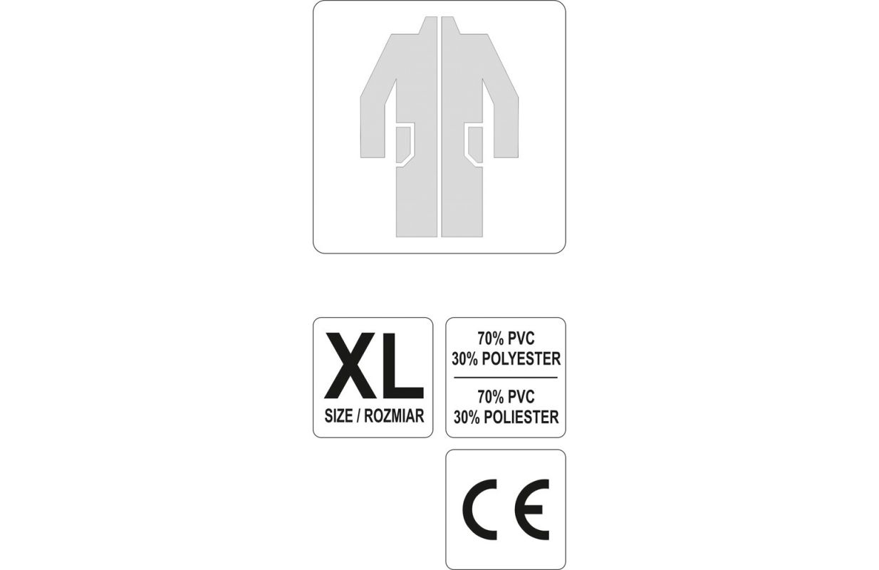Lietusmētelis dzeltens, 70% PVC, 30% poliesters. Ar rāvējslēdzēju ar papildu siksnām. Tvaika nosūcējs ar saitēm, divām ārējām kabatām, vējstikla aprocēm. Ventilācijas sistēma aizmugurē. XL izmērs.