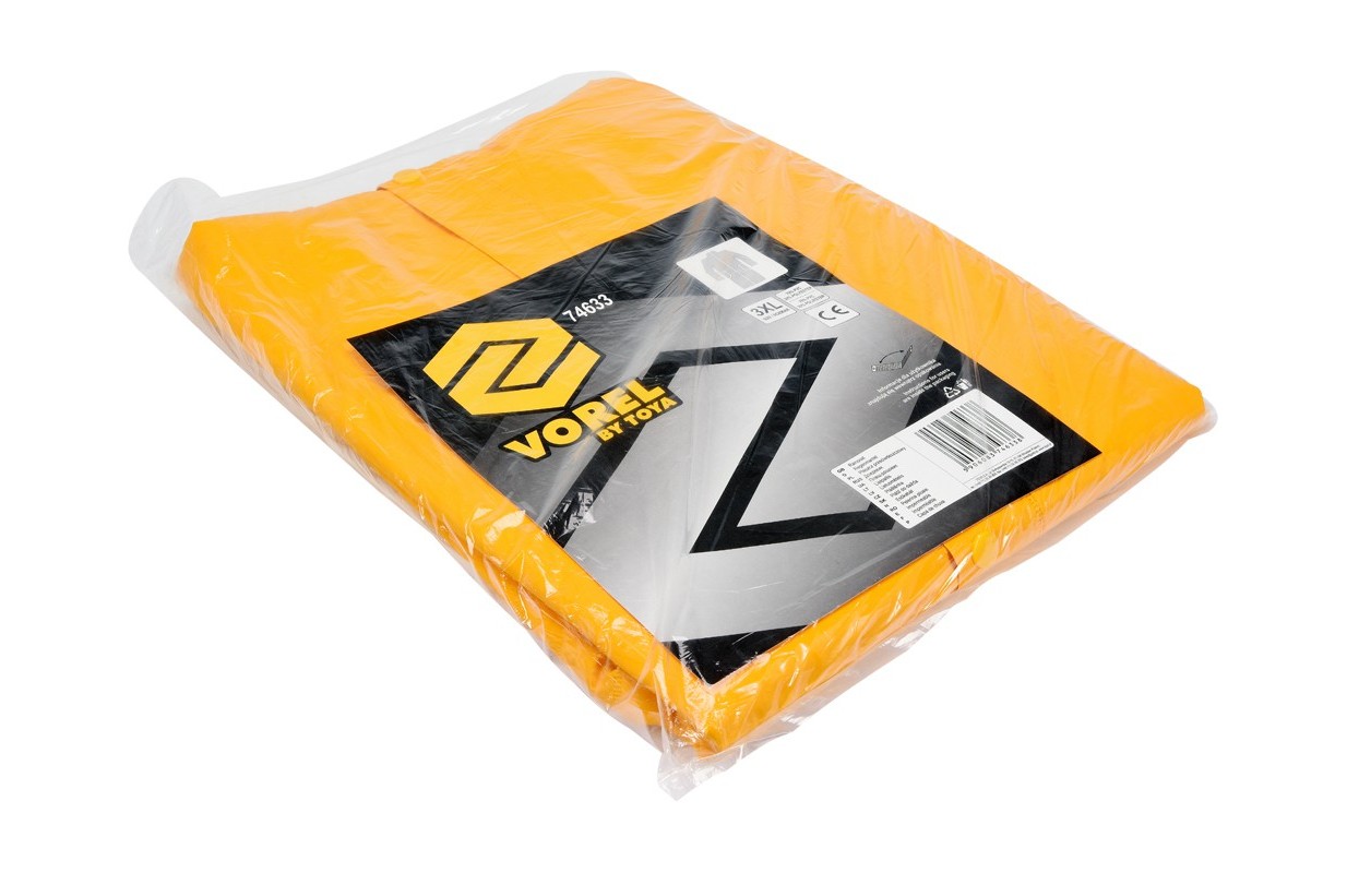 XXXL RŪPNĪCAS IZMĒRS: SMAIDS LIETŪ, F-RY NR. FY7702; IZMĒRS XXXL, KRĀSA: DZELTENA, MATERIĀLS: AUDUMS R-9025 0.28MM 70% PVC / 30% POLIESTERS; 2 LIELAS PRIEKŠĒJĀS KABATAS (19X17 CM), KATRA AR ATLOKU; BALTS VIENGABALAINS PRIEKŠĒJAIS RĀVĒJSLĒDZĒJS AR SLĒGTU VĒTRAS VĀRSTU; 4 DZELTENI PLASTMASAS SLĒGMEHĀNISMI UZ VĒTRAS VĀRSTA; 2 VENTILĀCIJAS ATVERES ZEM PADUSĒM UN 3 CAURUMI AIZMUGURĒ (KĀ PIEVIENOTAJĀ FOTOATTĒLĀ); TEKSTILA MEŽĢĪNES TVAIKA NOSŪCĒJĀ UN APAKŠMALĀ REGULĒŠANAI; APROČU AIZDARE (DZELTENS PLASTMASAS AIZBĪDNIS).