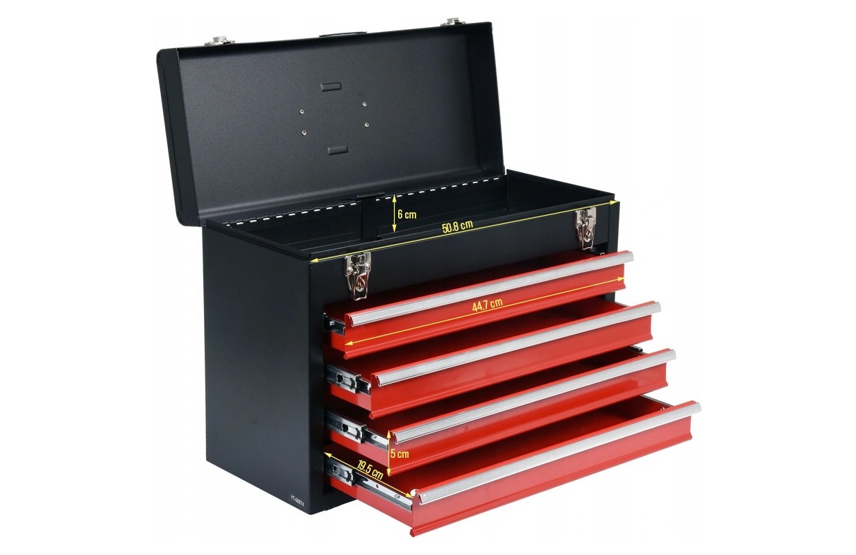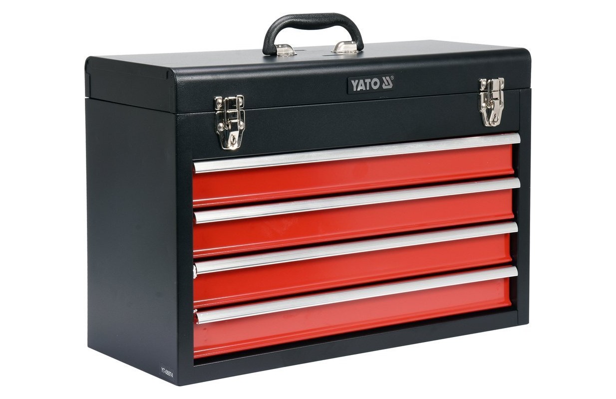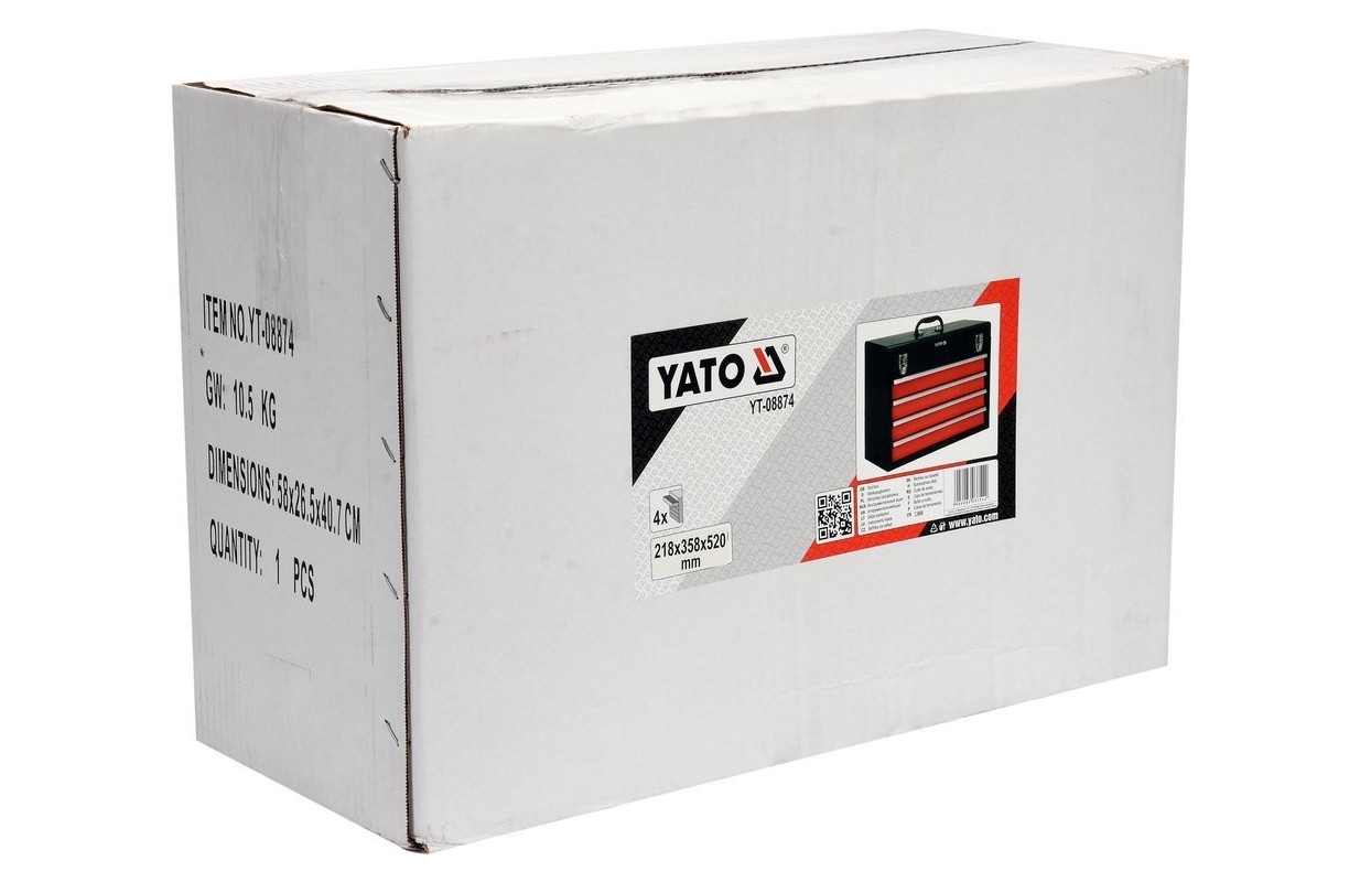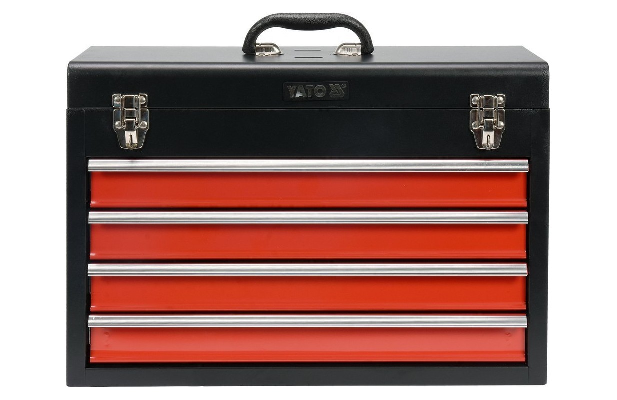 YATO instrumentu kaste rokas instrumentiem, kas aprīkota ar atvilktnēm , kas uzstādītas uz metāla lodīšu vadotnēm . Viņiem ir papildu augšējais nodalījums, kas aizveras ar metāla aizbīdņiem.