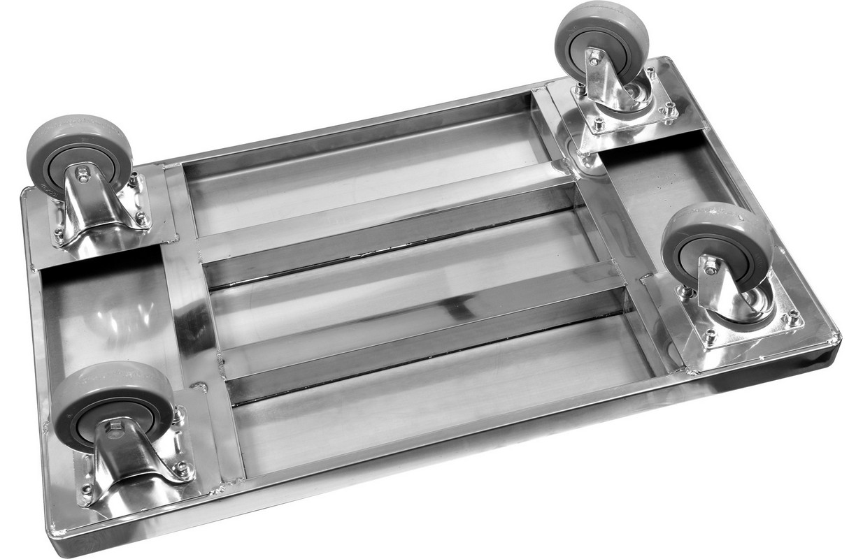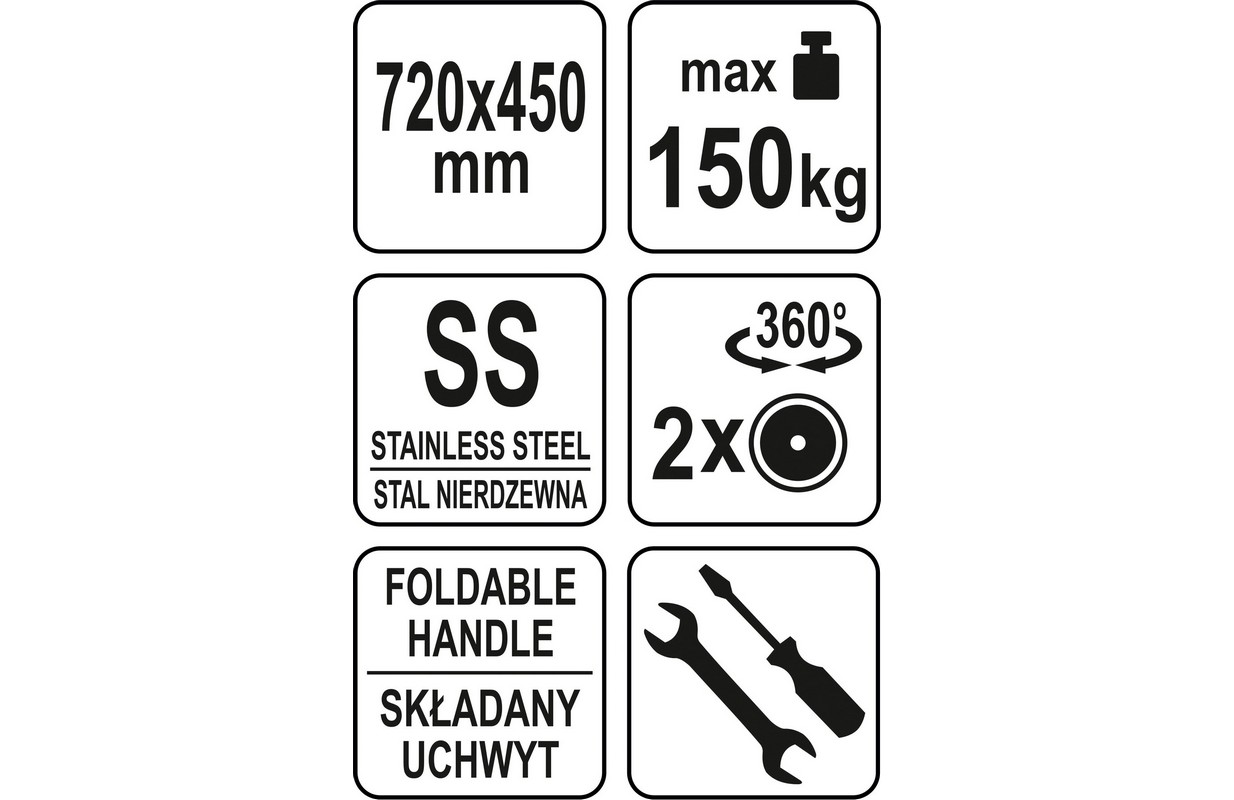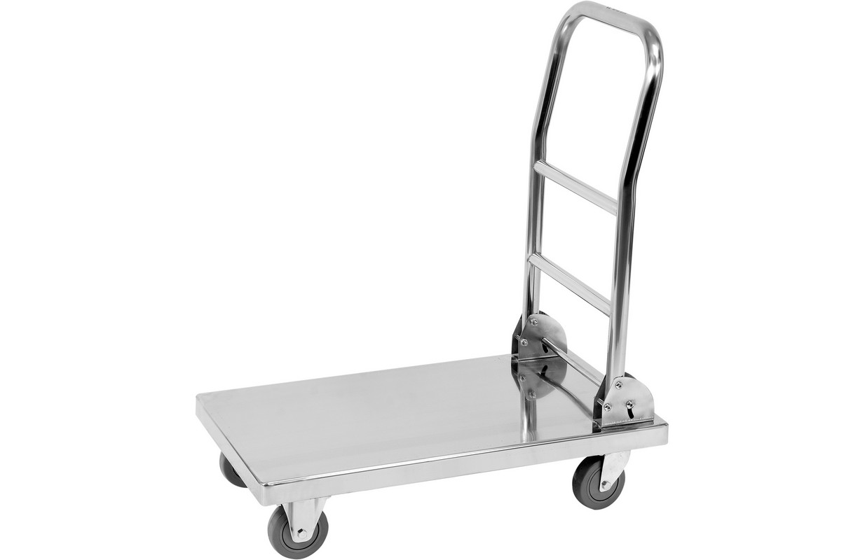 YATO plakanvirsmas kravas automašīna ar maks. kravnesību 150 kg. Ratiņi ir izgatavoti no augstas kvalitātes nerūsējošā tērauda loksnes tipa 201. Īpašais dizains, izmantojot virkni pastiprinājumu zem platformas, garantē ratiņu kravnesību līdz 150 kg. Pateicoties vieglajai, bet izturīgajai konstrukcijai, tas ļauj pārvadāt smagos produktus, piemēram, galda piederumus vai dzērienus, kā arī beztaras izstrādājumus. Iekraušanas platformas izmēri 600x430mm. Tas atvieglo manevrēšanu šauros koridoros un atvieglo piekļuvi glabātavām. Augstas kvalitātes nerūsējošā tērauda izmantošana garantē paaugstinātu izturību pret bojājumiem un skrāpējumiem. Tāpēc mūsu produkts ir piemērots intensīvai lietošanai daudzus gadus. Turklāt nerūsējošā tērauda virsmas bez porām palīdz uzturēt ratiņus tīrus. Salokāmais rokturis ļauj viegli pārvietot produktu un uzglabāt to, piemēram, zem uzglabāšanas plauktiem, lai ratiņi neaizņemtu uzglabāšanas vietu. Ratiņiem ir 4 riteņi, kas izgatavoti no augstas kvalitātes pelēkas krāsas termoplastiskās gumijas. Tādējādi tas nesaskrāpē grīdu un neatstāj pēdas uz tā. Stingras, bet elastīgas TPR izmantošana nodrošina arī ļoti klusu darbību. Šis efekts tiek panākts arī, izmantojot gultņus, kas vēl vairāk ievērojami palielina to kalpošanas laiku. Tik daudz apļu rotē par 360 grādiem, kas ļauj manevrēt grūti sasniedzamās telpās un šauros koridoros. Šiem riteņiem papildus ir bremzes. Priekšējie riteņi ir fiksēti. Universālie transporta ratiņi YATO izmantošanai sabiedriskās ēdināšanas uzņēmumos un citos komunālajos pakalpojumos. Tas ir ideāli piemērots pārtikas, pārtikas, kartona kastu un citu produktu transportēšanai.