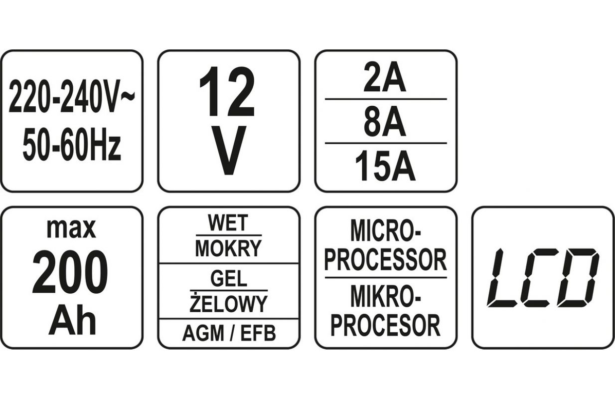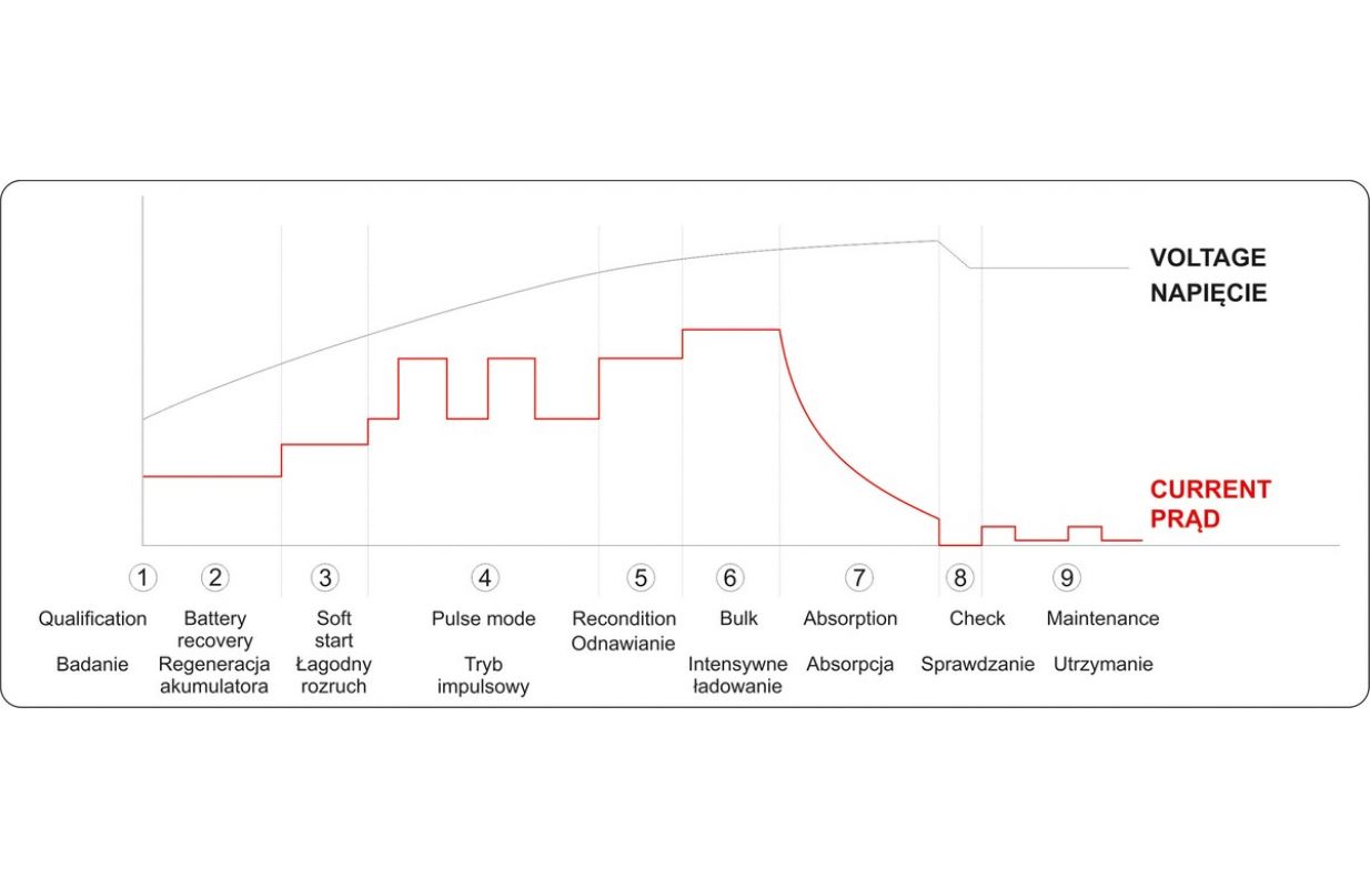Profesionāla ierīce 6V un 12V akumulatoru uzlādei motociklos, automašīnās un piegādes furgonos, lauksaimniecības traktoros, motorlaivās. Ļauj uzlādēt tā saucamās mitrās baterijas, gēla baterijas, AGM un EFB baterijas. Vēlamā sprieguma uzturēšanas funkcija baterijās, kas darbojas atpūtas režīmā - saglabāšanas uzlāde