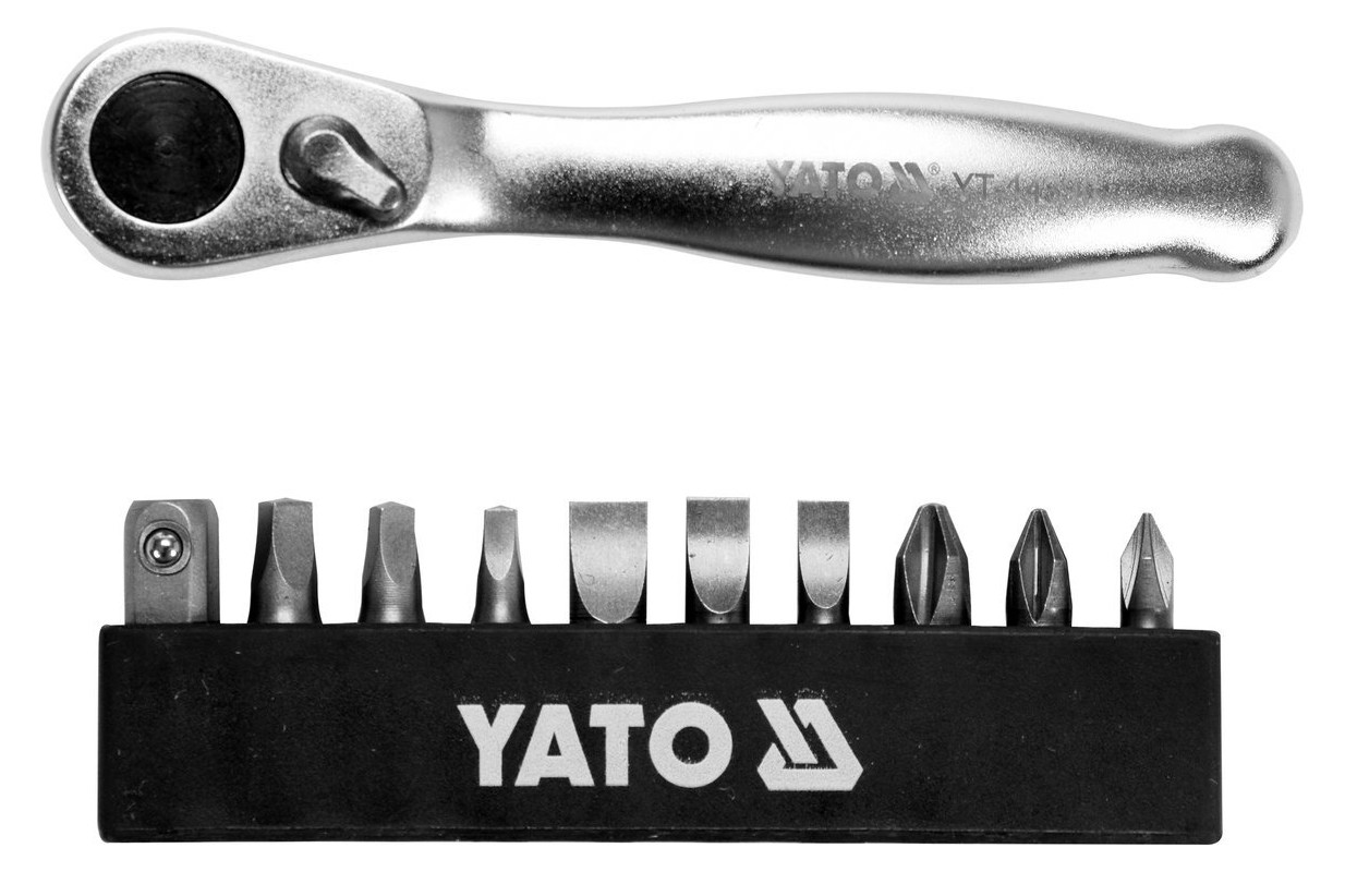Набор бит с трещоткой 1/4 от Yato YT-14390. Набор из 11 предметов с битами, адаптером и трещоткой 1/4 дюйма из прочной стали CrV 6150. Биты с трещоткой с сатинированным покрытием упакованы в удобную подставку.