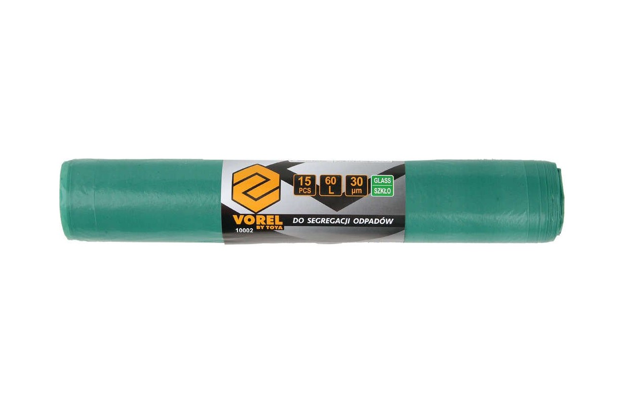 Мешки для мусора Vorel 60 л. Изготовлен из прочной фольги толщиной 0,030 мм, высотой 0,70 м и шириной 0,60 м. В одной упаковке содержится 15 пакетов соответствующей растяжки и прочных швов. Зеленый продукт, предназначенный для выбрасывания чистых банок, бутылок и другой стеклянной тары и т. д. Собранные отходы, независимо от их вида, должны быть чистыми. Собирайте стеклянные пакеты целиком, если вы их сломаете, есть риск разрыва пакета.