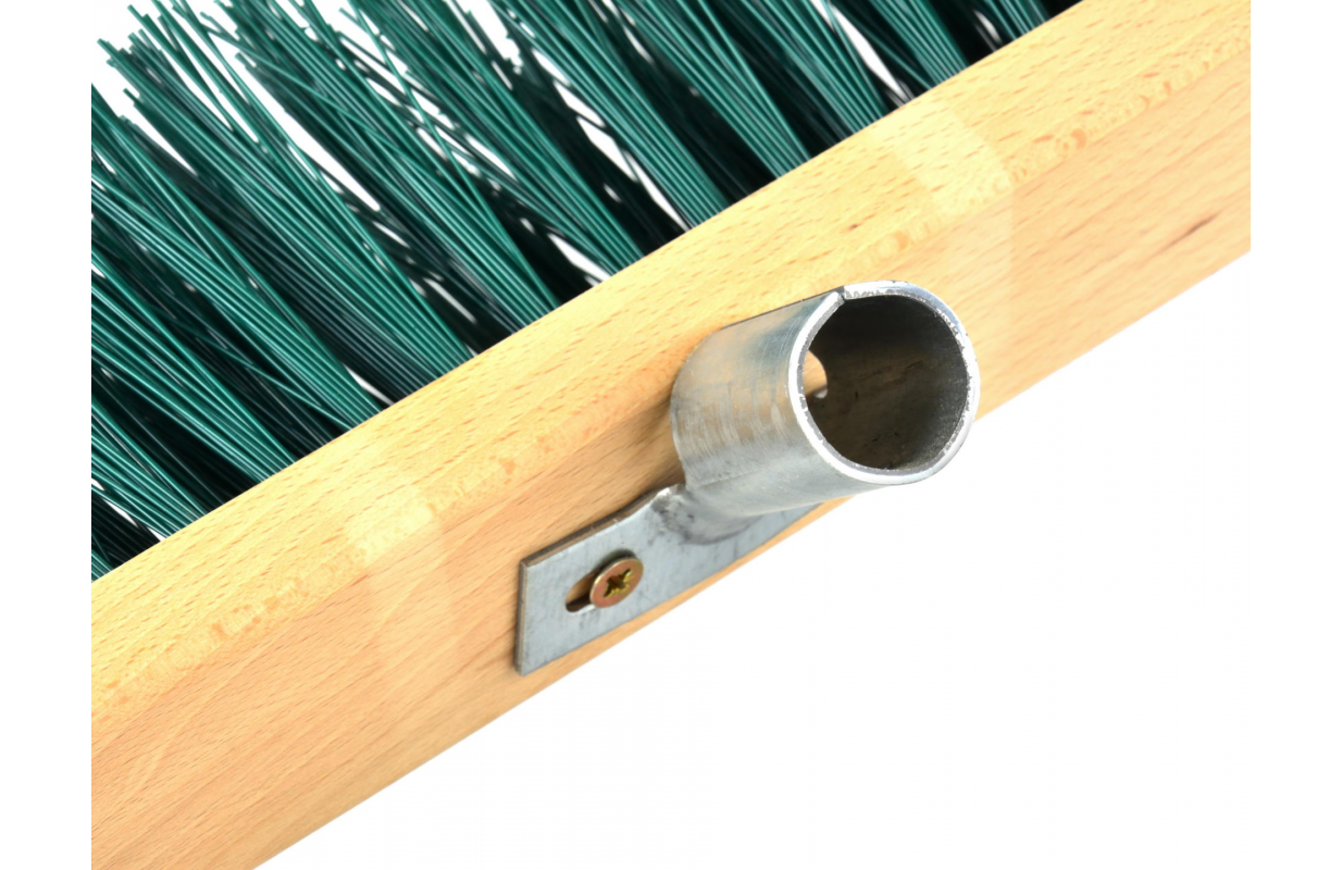 Метла «уличная» с жесткой капроновой щетиной, закрепленная на деревянном корпусе. Металлическая ручка для деревянной палки без резьбы.