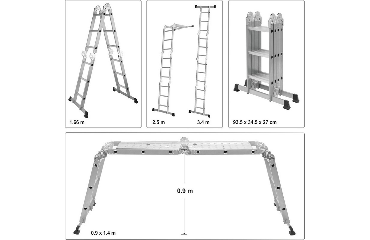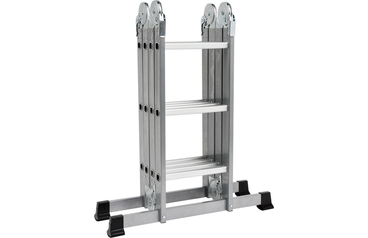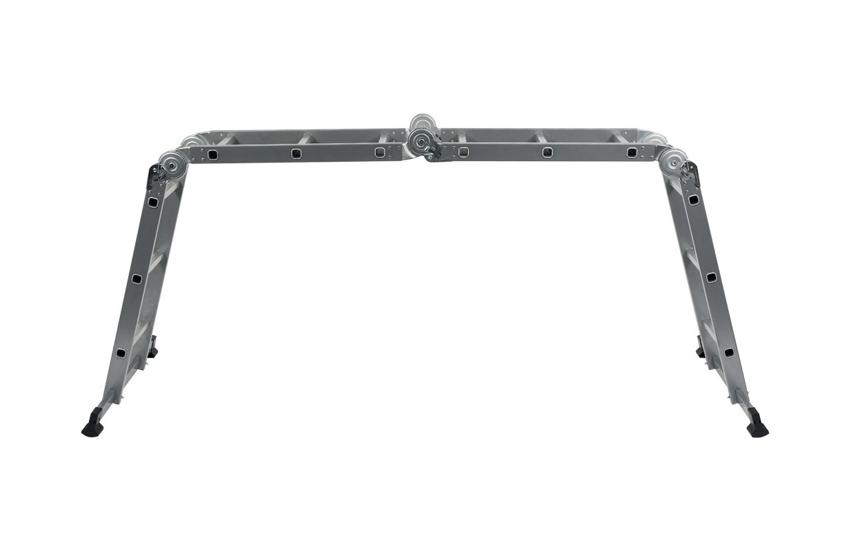 Многофункциональная лестница 4x3 с максимальной высотой 3,4 м. Соответствует требованиям европейского стандарта PN EN131 с грузоподъемностью 150 кг. Он состоит из четырех сегментов, соединенных прочными и долговечными соединениями. Все соединения имеют болтовые замки, что позволяет быстро и удобно изменять настройки лестницы в соответствии с вашими потребностями. Благодаря этому его можно разместить во многих положениях, в том числе: