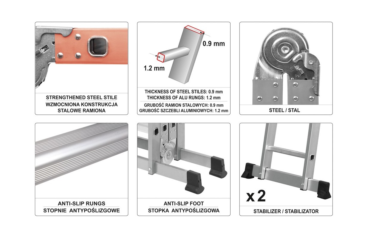Струны изготовлены из армированных стальных профилей толщиной 0,9 мм, которые намного прочнее алюминия. Это повышает устойчивость и безопасность и продлевает срок службы лестницы. Алюминиевые сплавы изготавливаются из профилей толщиной 1,2 мм, которые с каждой стороны имеют профилированные нескользящие поверхности. Кроме того, лестница заканчивается двумя широкими стабилизаторами, что значительно повышает устойчивость и безопасность во время использования. Каждый стабилизатор имеет две профилированные противоскользящие ножки, которые увеличивают сцепление с основанием в каждом положении лестницы.