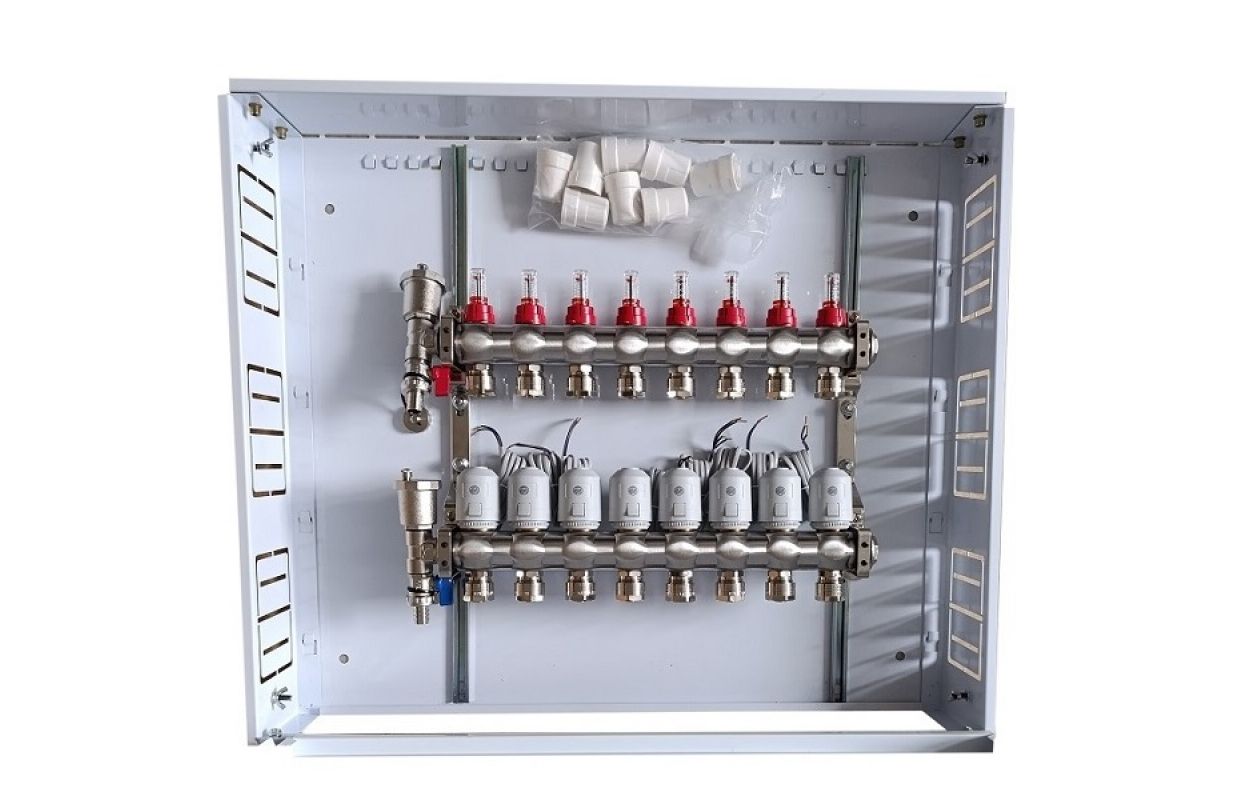 8-контурный коллектор для теплого пола с термоприводами NC AC230 В и расходомерами. В комплект входят: металлический короб для скрытого монтажа, 8-контурный коллектор, расходомеры и термоприводы NC AC230 В.