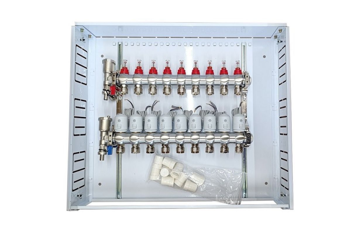 Коллектор для напольного отопления, 9 контуров, с термоприводами (NC), переменный ток 230 В и расходомерами. В комплект входят: металлический короб для скрытого монтажа, коллектор на 9 контуров, расходомеры и термоприводы (NC), переменный ток 230 В.