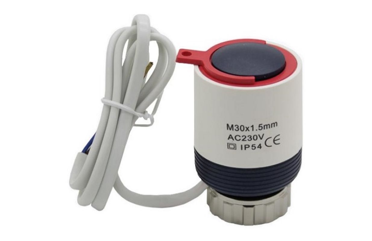 Технические характеристики: Применение: система водяного отопления. Тип термопривода: НЗ (нормально закрытый). Рабочее напряжение: 230 В переменного тока, 50/60 Гц. Пусковой ток: 50 мА. Время срабатывания: до 180 с (клапан открыт/закрыт). Потребляемая мощность: 2 Вт. Мощность: 100 Н (± 10%). Монтаж: подключение к коллектору. Резьба: M30x1,5 мм. Длина кабеля: 80 см. Рабочая температура: от -20°C до +50°C. Рабочая влажность: 5%~95% относительной влажности (без конденсата). Класс защиты: IP54. Размеры: 40 x 40 x 68 мм. Цвет: белый. Сертификаты: CE. EN60730.