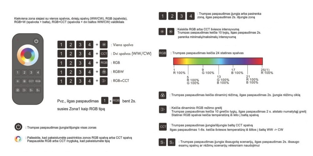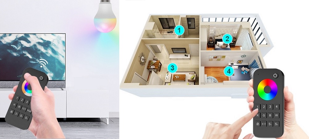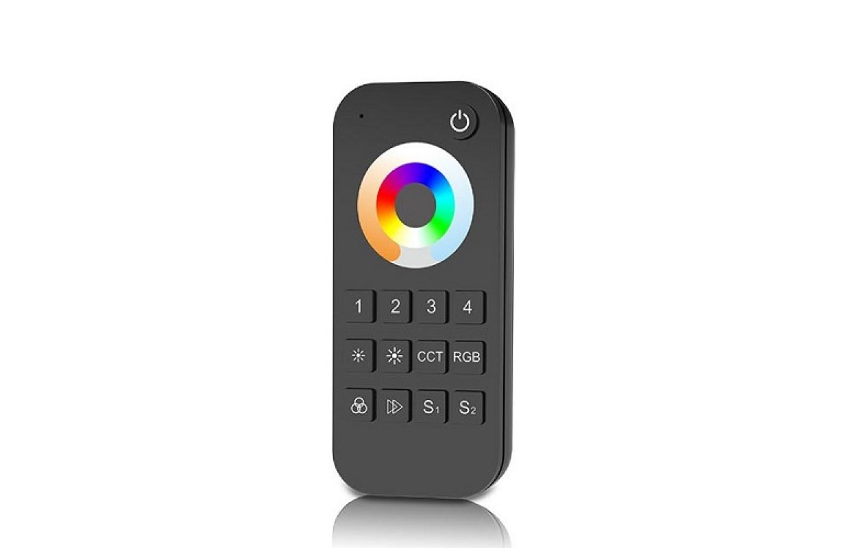 Радиочастотный пульт дистанционного управления для светодиодной ленты RGBW, 2,4 ГГц, 4 зоны, с сенсорным колесом, поддерживает 2 сцены и 10 режимов освещения.