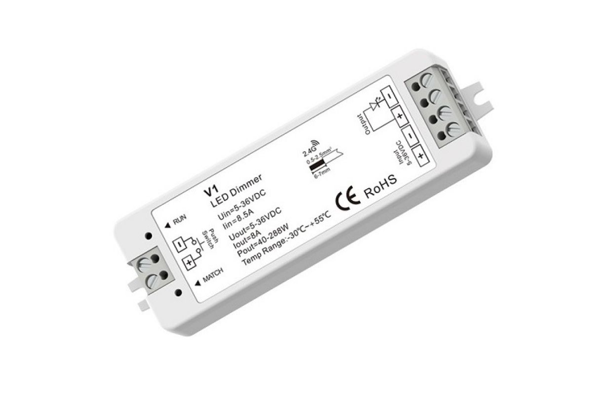 Технические данные: Модель продукта: V1. Совместимость: Skydance R1, R6-1, RT1, RU4, R6, RA1, RT6, RS1, RS6, R11; R15, R16, R8-1, R9, RT4, R8, RT9, RS3, RS4, RS8, R21, R22; T1, T1-1, T1-K, KV, KC; T3, T3-1, T3-K. Количество каналов: 1. Управляемые системы освещения: одноцветные. Рабочая частота: 2,4 ГГц. Напряжение питания: 5–36 В постоянного тока. Выходное напряжение: 5–36 В постоянного тока. Выходной ток: 8 А. Выходная мощность: 40 Вт при 5 В; 96 Вт при 12 В; 192 Вт при 24 В; 288 Вт при 36 В. Частота ШИМ: 2000 Гц. Оттенки серого: 4096 уровней. Диапазон регулировки яркости: 0–100%. Дальность действия: до 30 м. Класс защиты: IP20 (не водонепроницаемый). Сертификаты: CE, EMC, LVD, RED, RoHS. Рабочая температура: от -30 до +55 °C. Размеры: 97 x 33 x 18 мм. Цвет: белый. Вес: 42 г.