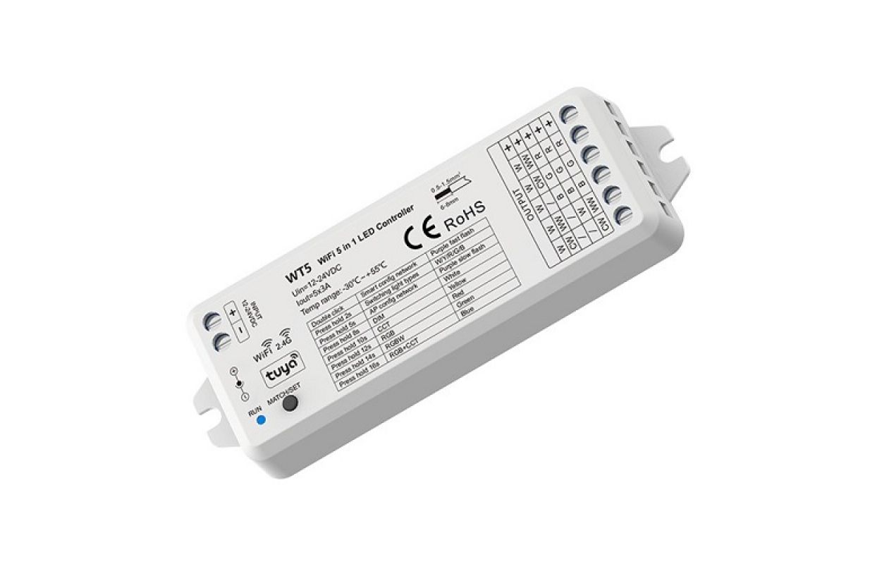 Контроллер постоянного напряжения W5 12-24 В постоянного тока, 5 x 3 А, для светодиодных лент RGB/RGBW/CCT, 5 каналов, 4 сценария, Wi-Fi, Tuya.