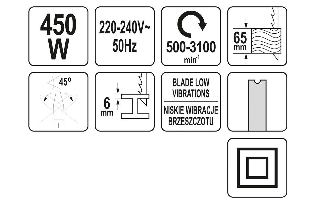 глубина пропила: дерево: 65 мм, сталь: 6 мм