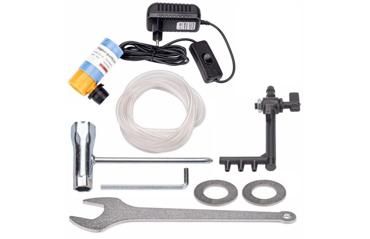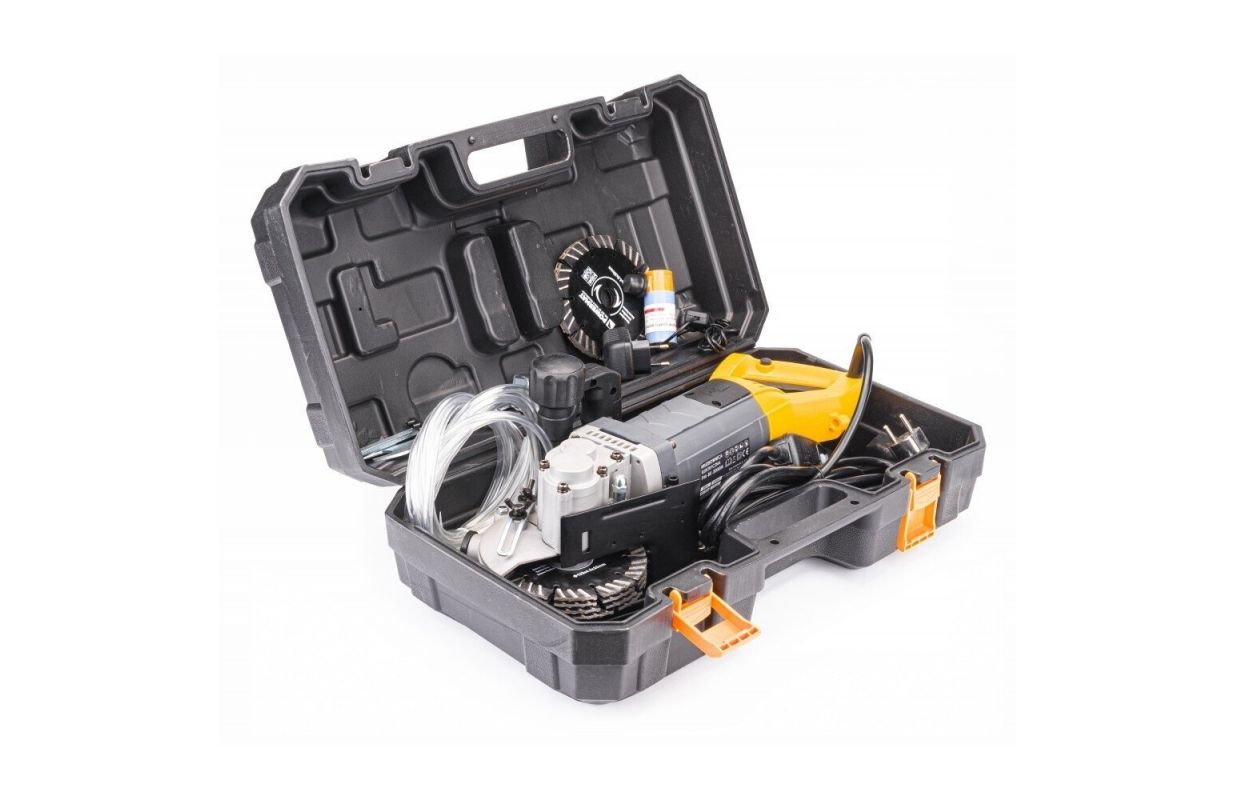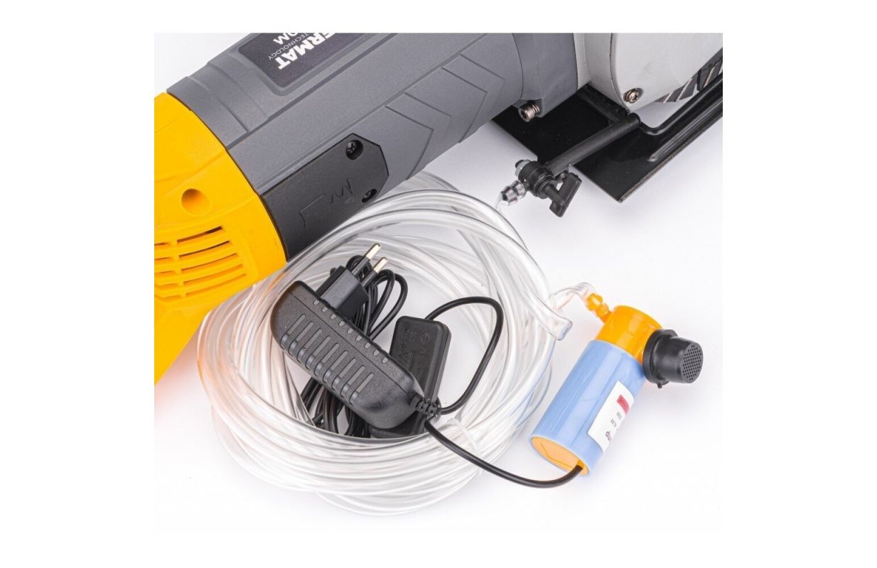 Штроборез оснащен системой распыления воды для дисков вместе с насосом и шлангом, который мягко охлаждает их во время резки и значительно уменьшает образование пыли во время работы.