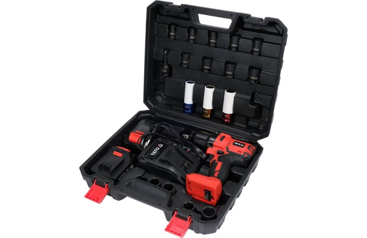 гайковерт (YT-828061) | аккумулятор x2 | зарядное устройство | торцевая головка для алюминиевых дисков x3 | ударная торцевая головка x13 | ударный удлинитель