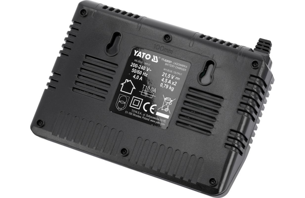 выходной ток: 2 x 4500 мА Время зарядки: 35 мин 2 Ач аккумулятор YT-828461, 55 мин 2 Ач аккумулятор YT-82842 40 мин 3 Ач аккумулятор YT-828462, 90 мин 3 Ач аккумулятор YT-82843 55 мин 4 Ач аккумулятор YT-828463, 120 мин 4 Ач аккумулятор YT-82844 78 мин 6 Ач аккумулятор YT-828464, 90 мин 6 Ач аккумулятор YT-82845 120 мин 9 Ач аккумулятор YT-828465 Встроенный индикатор заряда Вес: 0,79 кг
