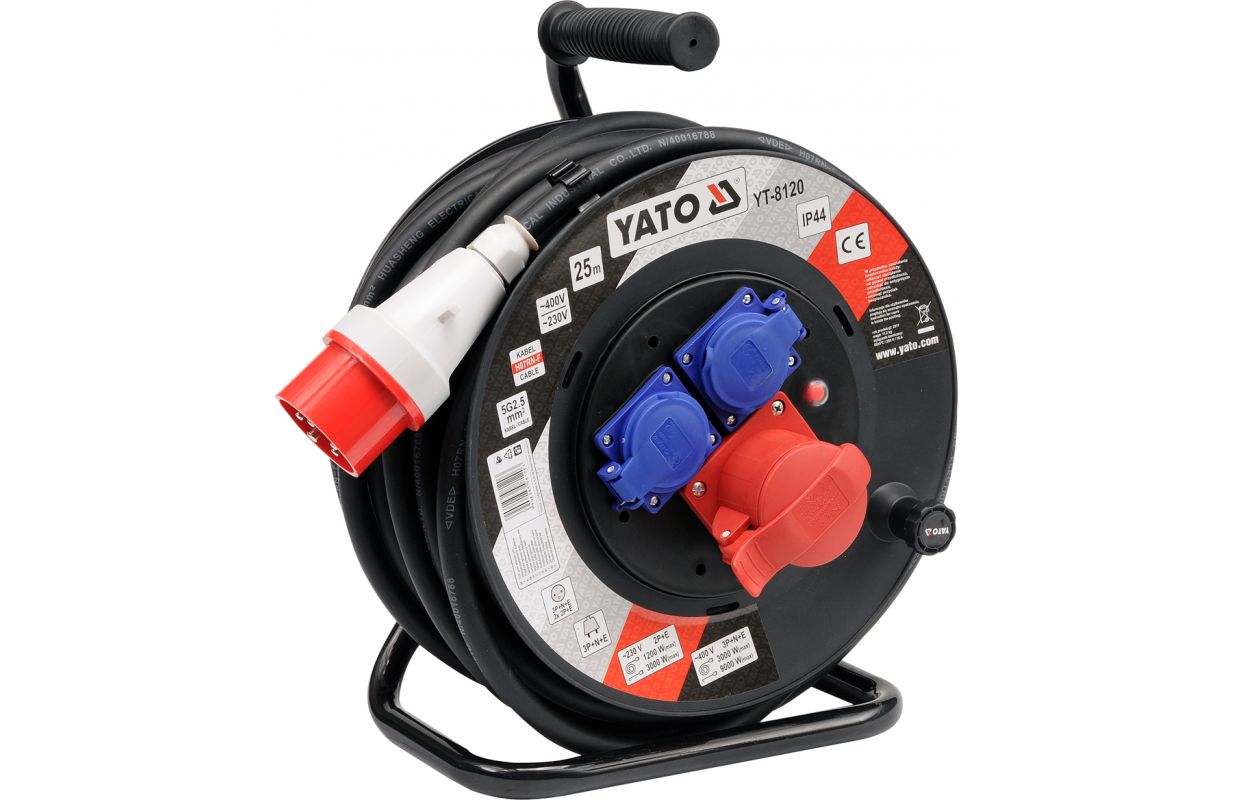 Удлинитель строительно-мастерский YT-8120 , длиной 25 метров, с 2 розетками на номинальное напряжение ~230В, замком от детей и одной розеткой на номинальное напряжение ~400В. Вилка питания представляет собой 5-контактную вилку с номинальным напряжением ~400В. Удлинитель с термозащитой. Шнур в неопреновой резиновой оболочке, намотанный на барабан из прочного пластика, делает удлинитель пригодным для использования как в помещении, так и на улице, например, на стройке, в саду, на площадях перед производственными предприятиями. Сечение отдельных проводов составляет целых 2,5 мм², благодаря чему падение напряжения по всей длине удлинителя минимально. Это обеспечивает бесперебойное питание устройств, требующих высокого тока, таких как сварочные аппараты, компрессоры или другие устройства, в которых используются, например, асинхронные двигатели. Барабан смонтирован на прочной металлической раме с эргономичной ручкой. Ручка, расположенная на краю барабана, ускоряет намотку, а крюк, прикрепленный к кабелю в нескольких сантиметрах от вилки, позволяет прикрепить его, например, к краю барабана, что значительно облегчает хранение и транспортировку. свернутого удлинителя.