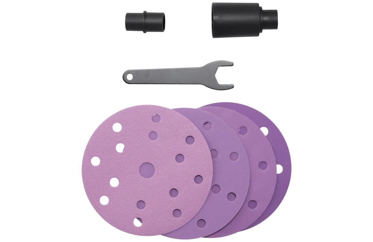 В комплект шлифовальной машины также добавлен набор из четырех шлифовальных бумаг, для изготовления которых использованы керамические зерна, что, помимо прочего, означает более длительный срок службы. Керамическое зерно более твердое и раскрывается при шлифовке, поэтому диски можно использовать также для металлов и других твердых материалов.