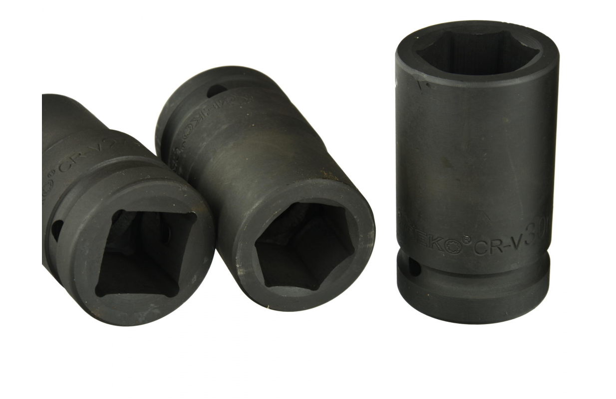 Ударные головки из стали CRV 1'' Головка изготовлена с высокой точностью, в соответствии с более высокими классами точности, указанными в стандарте. Розетки работают с пневматическими устройствами и трещотками, которые работают в тяжелых условиях при переменных нагрузках.