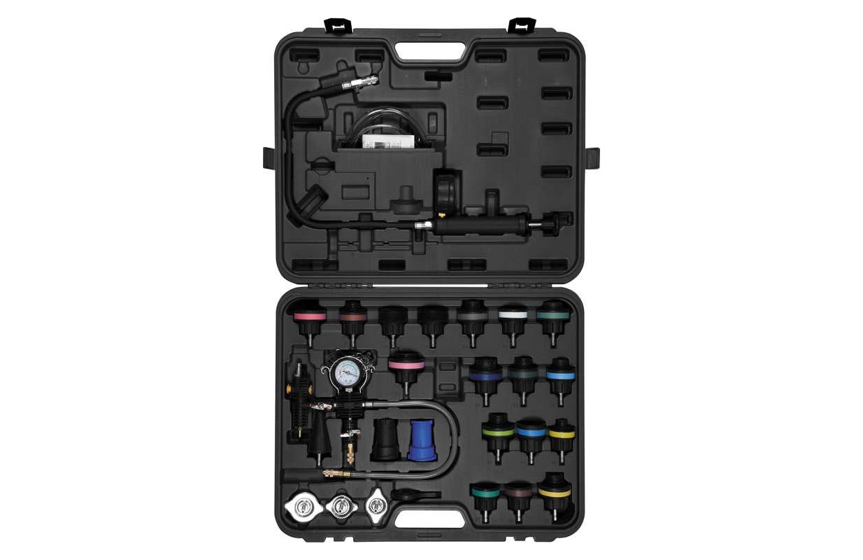 Набор из 28 предметов для проверки герметичности радиатора и быстрая замена охлаждающей жидкости Крышки с цветовой маркировкой облегчают выбор подходящей пробки для проверки. Тестер предназначен для автосервисов, диагностических станций и т.п.