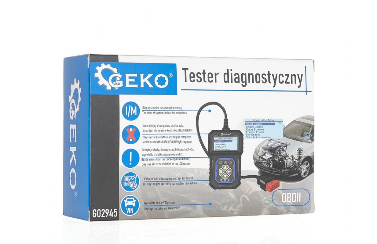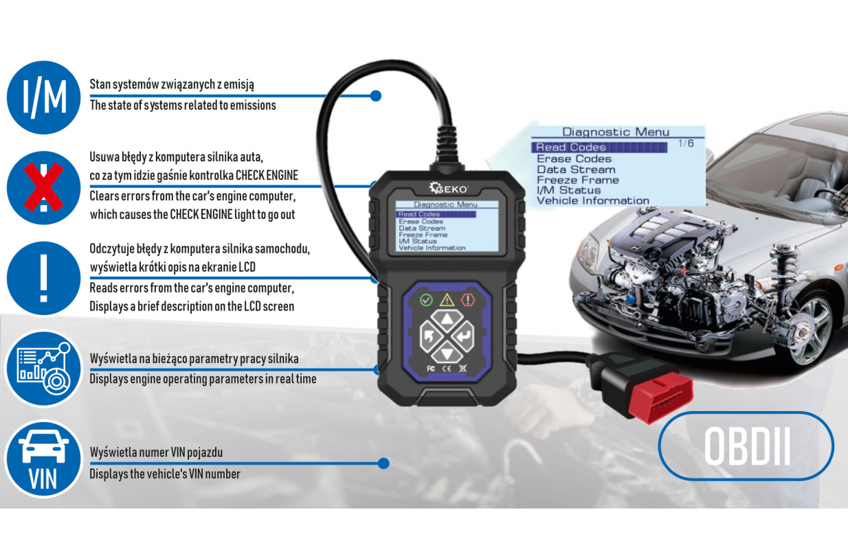 Прибор используется для диагностики двигателей всех транспортных средств, соответствующих стандарту OBDII, с напряжением 12В и стандартным 16-контактным разъемом.
