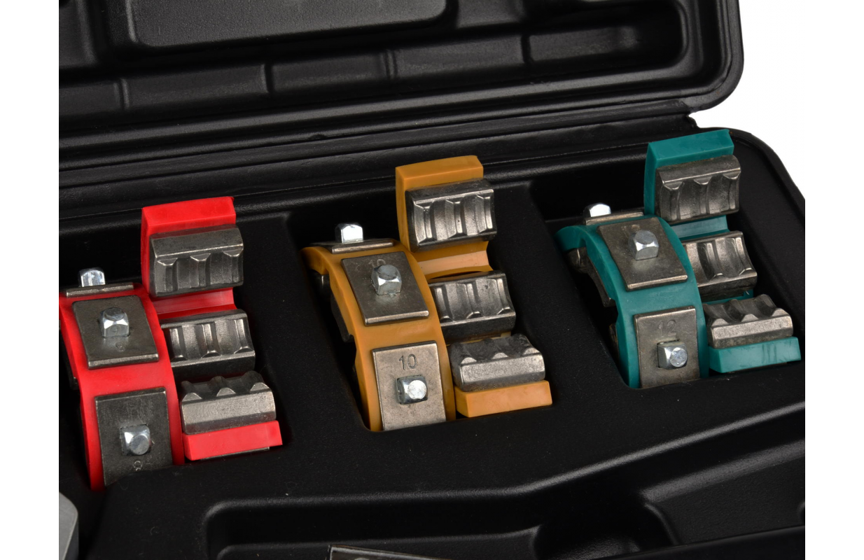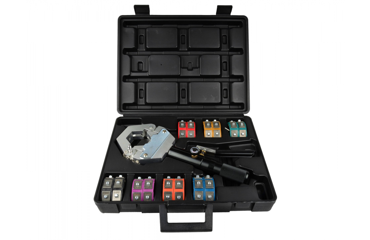 Инструмент для обжима концов шланга кондиционера - очень полезный простой инструмент для мастерских по ремонту автомобильных кондиционеров. Обжимной инструмент позволяет обжимать клеммы быстро, легко и точно. Вместе с обжимным инструментом в комплект входят хомуты (плашки) для шлангов разного диаметра. Все вместе поставляется в прочном и эстетичном корпусе, поэтому его можно использовать как в мастерской, так и в полевых условиях.