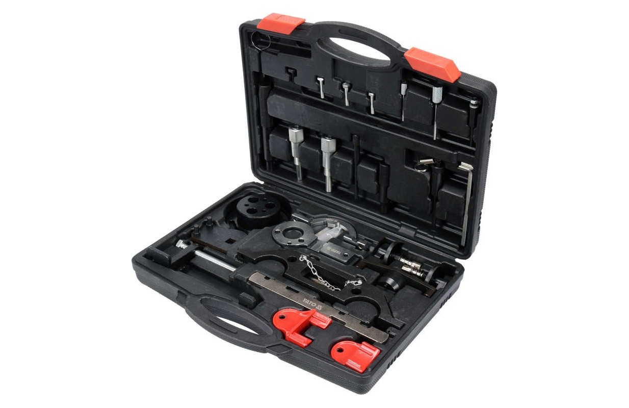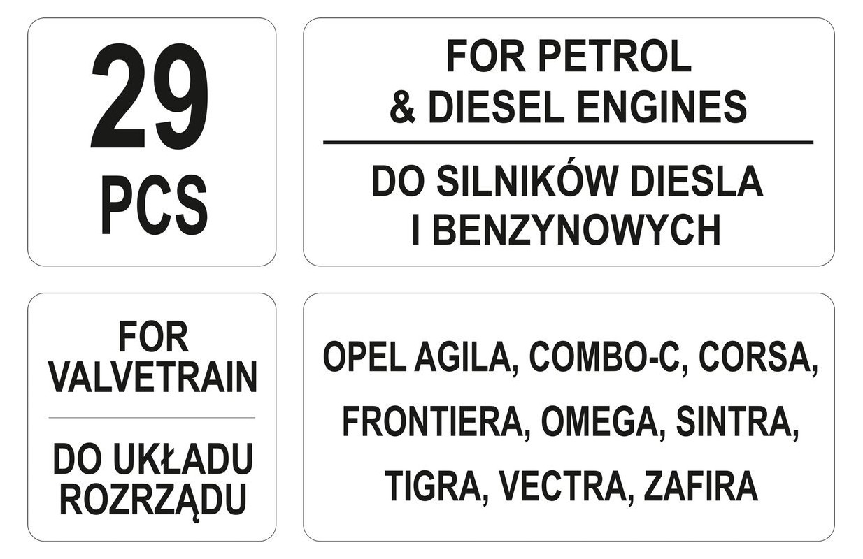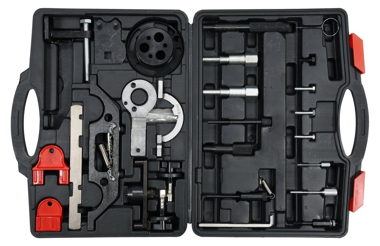 Профессиональный набор из 29 деталей, предназначенных для блокировки и регулировки фаз газораспределения в дизельных и бензиновых двигателях.