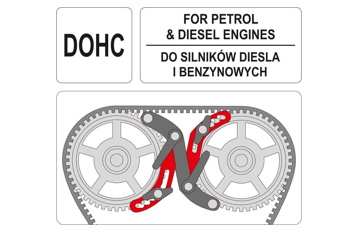 Профессиональный замок, предназначенный для блокировки двойных верхних распределительных валов (DOHC) в дизельных и бензиновых двигателях. Рекомендуется для специализированных автомобильных сервисов.