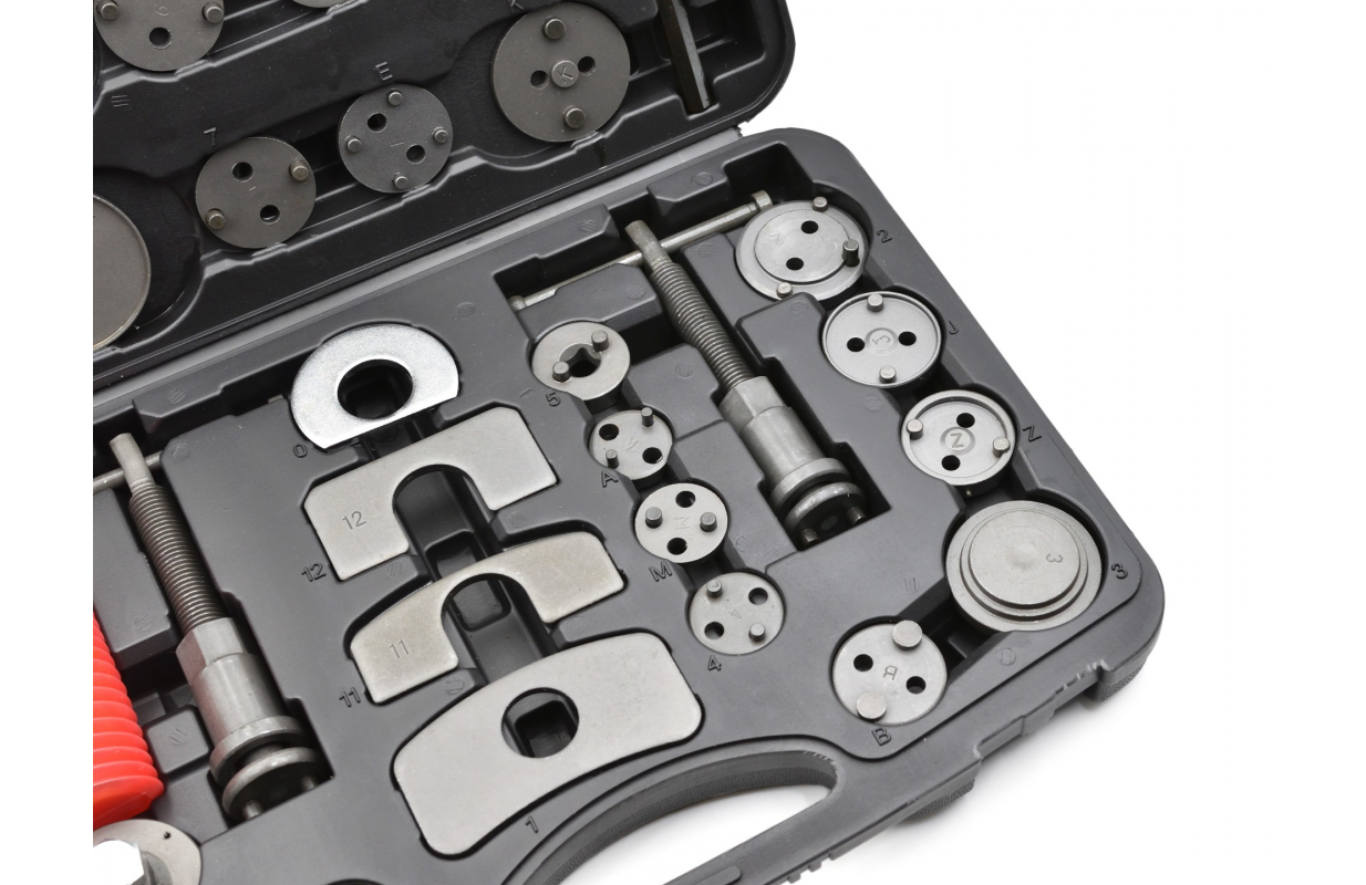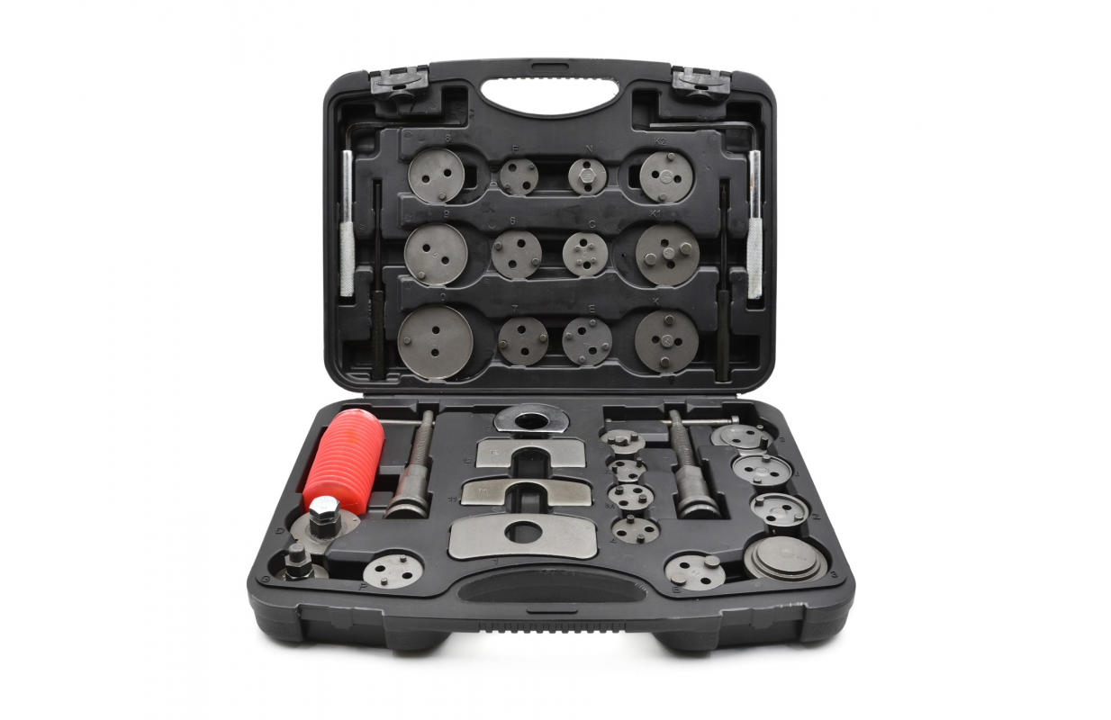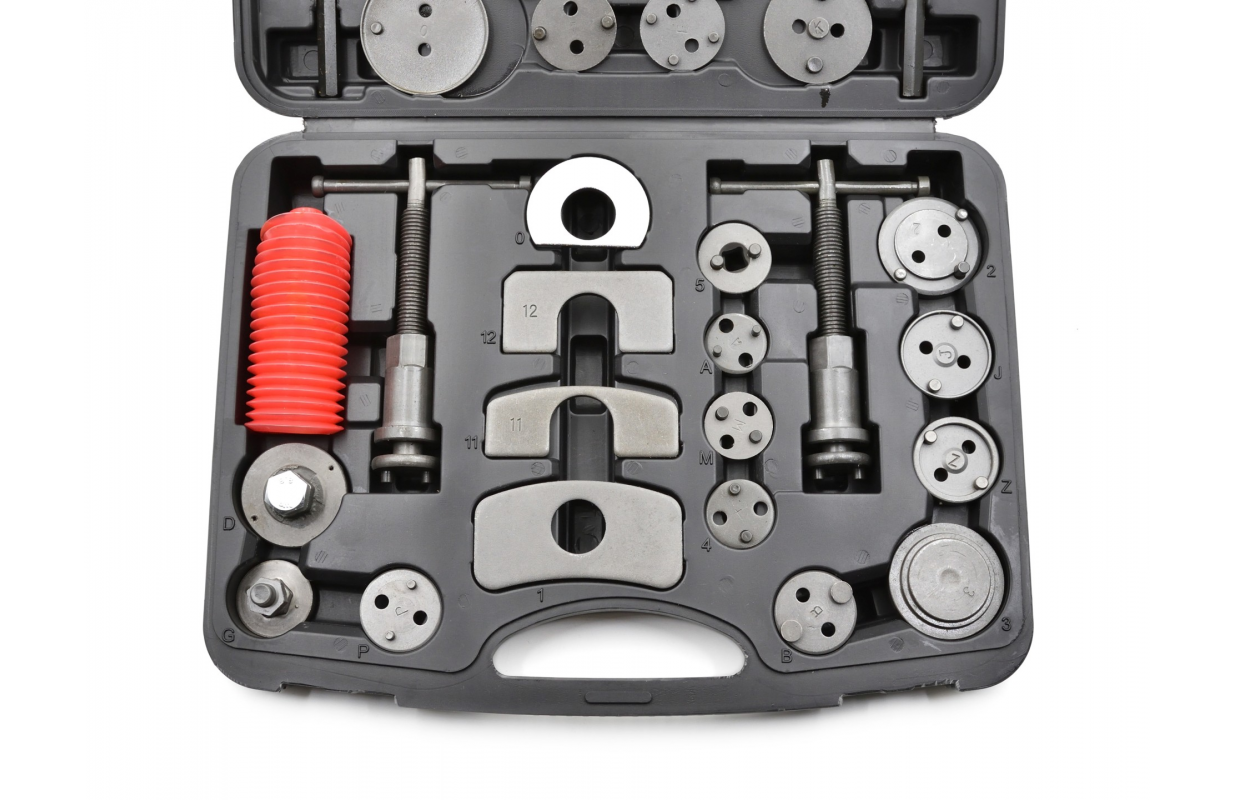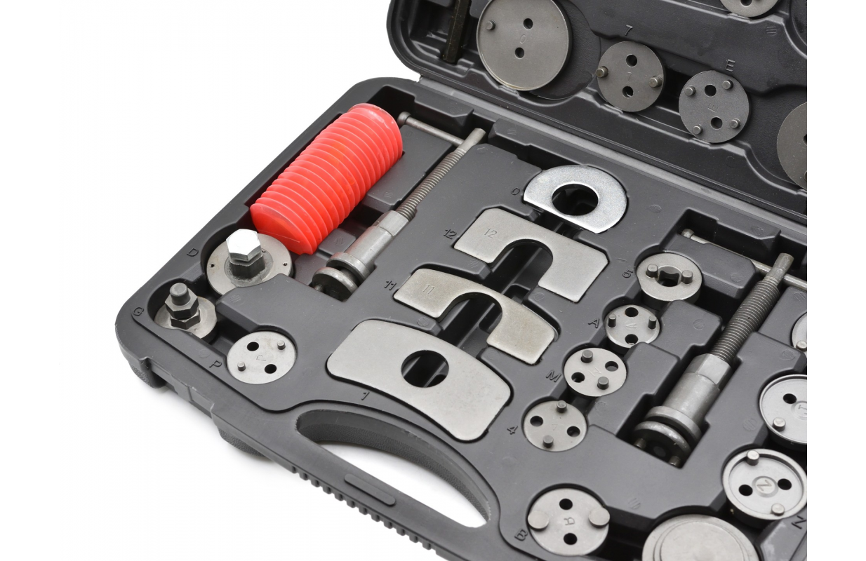 Профессиональный набор из 35 предметов для снятия/выжима тормозных поршней, необходимый при ремонте автомобилей, оснащенных дисковыми тормозами.