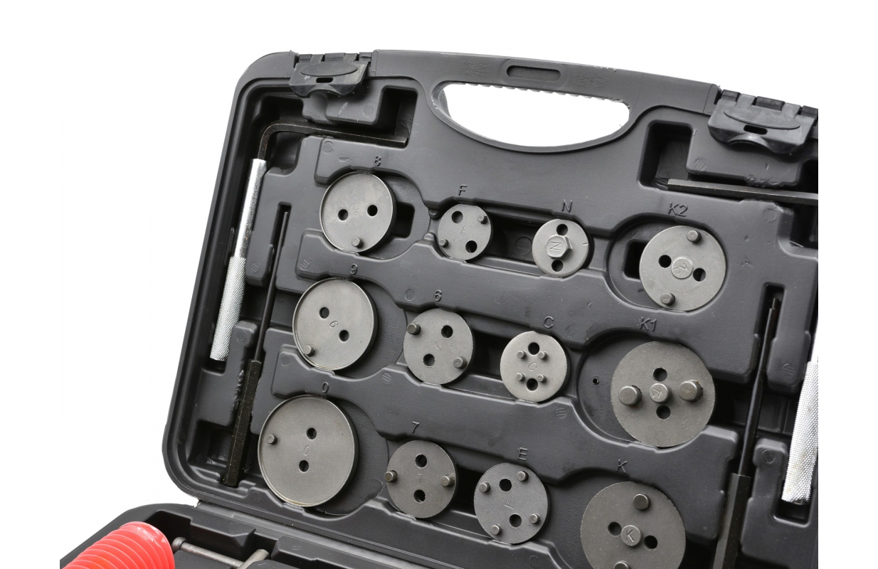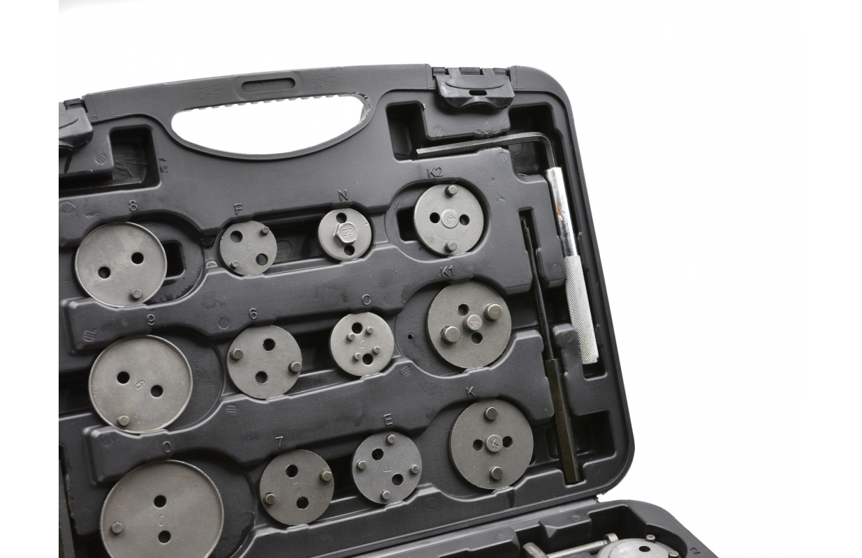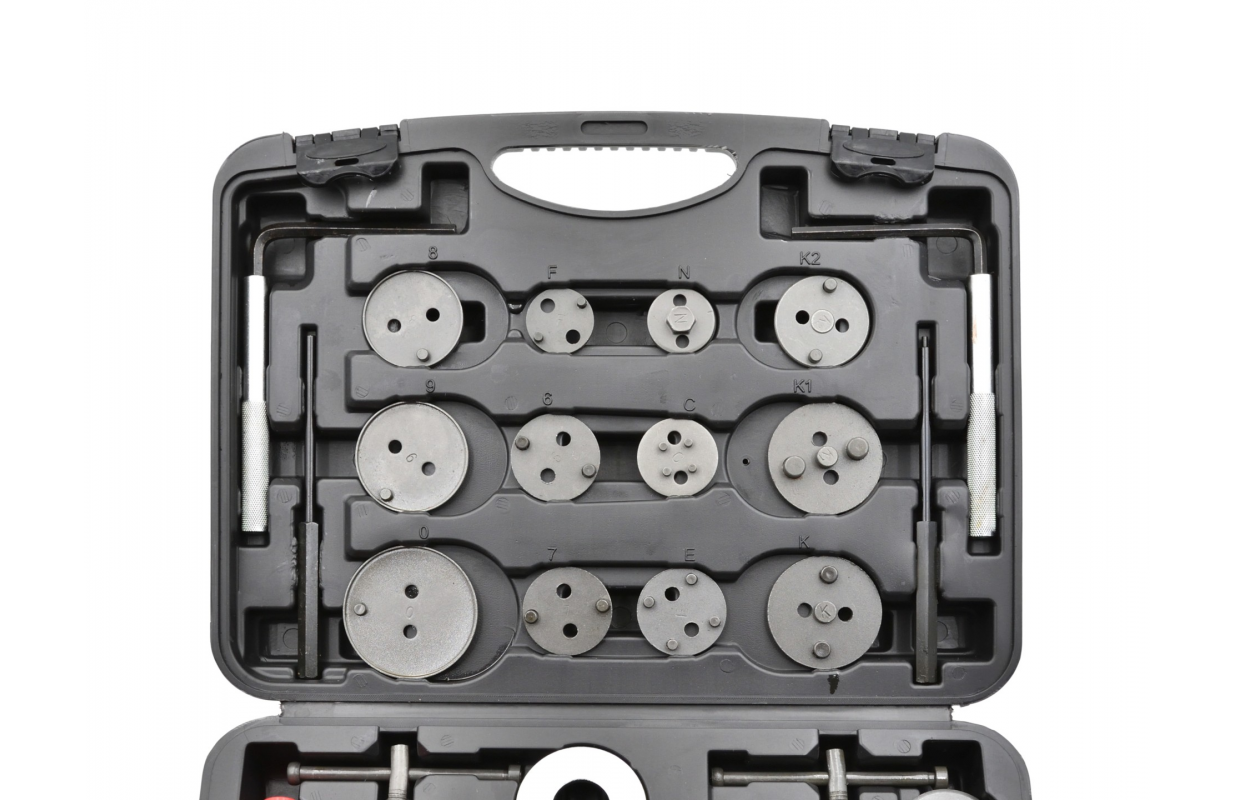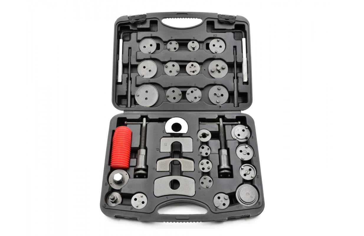 Профессиональный набор из 35 предметов для снятия/выжима тормозных поршней, необходимый при ремонте автомобилей, оснащенных дисковыми тормозами.