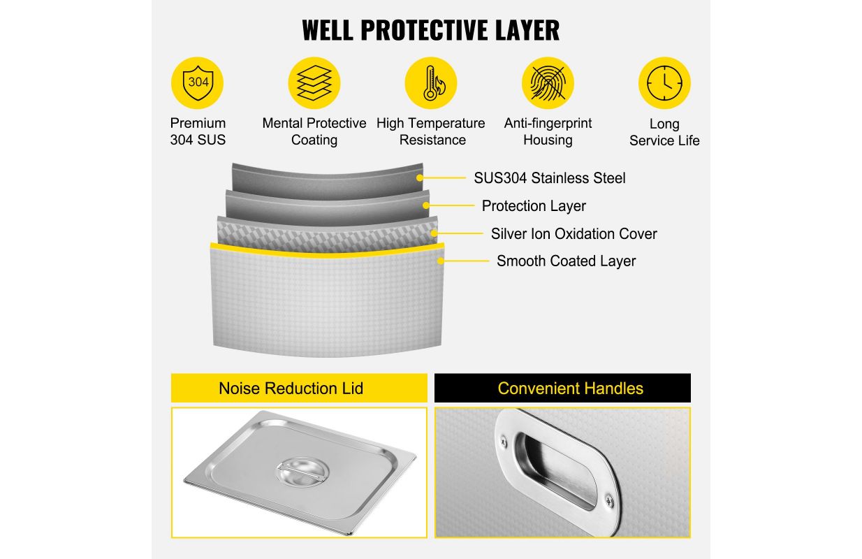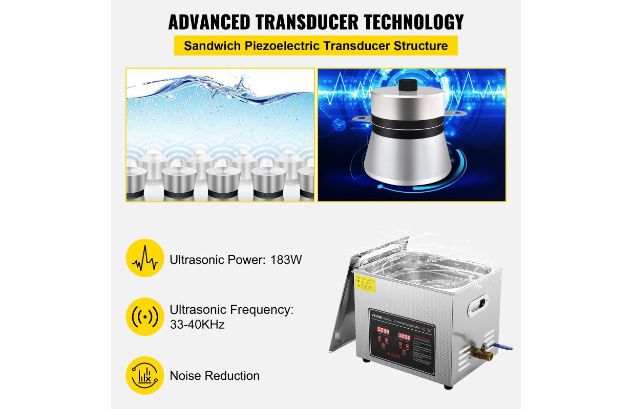 • Глубокая мощность очистки: С двумя промышленными ультразвуковыми преобразователями этот ультразвуковой очиститель деталей обладает мощностью очистки 183 Вт. Работая на частоте 33-40 кГц, он может легко устранять пятна, не повреждая ваши вещи. Он имеет прочный, дополнительно утолщенный резервуар из нержавеющей стали толщиной 0,04"/1 мм с вместимостью 10 литров, обеспечивая долговечность на протяжении многих лет.