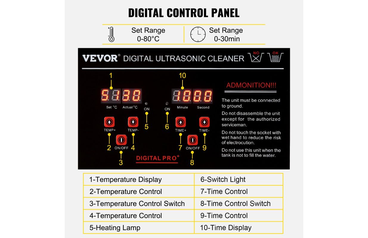 • Цифровая панель управления: Установка времени: 0-30 минут. Регулируемая температура нагрева: 0-80°C. Цифровой таймер и дисплей температуры обеспечивают точный контроль. Кроме того, у вас есть возможность использовать ультразвуковую очистку и нагрев одновременно. Имейте в виду, что более низкие частоты обеспечивают более эффективную очистку, но создают больше шума, что наиболее подходит для плоских поверхностей. Более высокие частоты обеспечивают более тихую работу и идеально подходят для изделий с маленькими отверстиями и щелями.