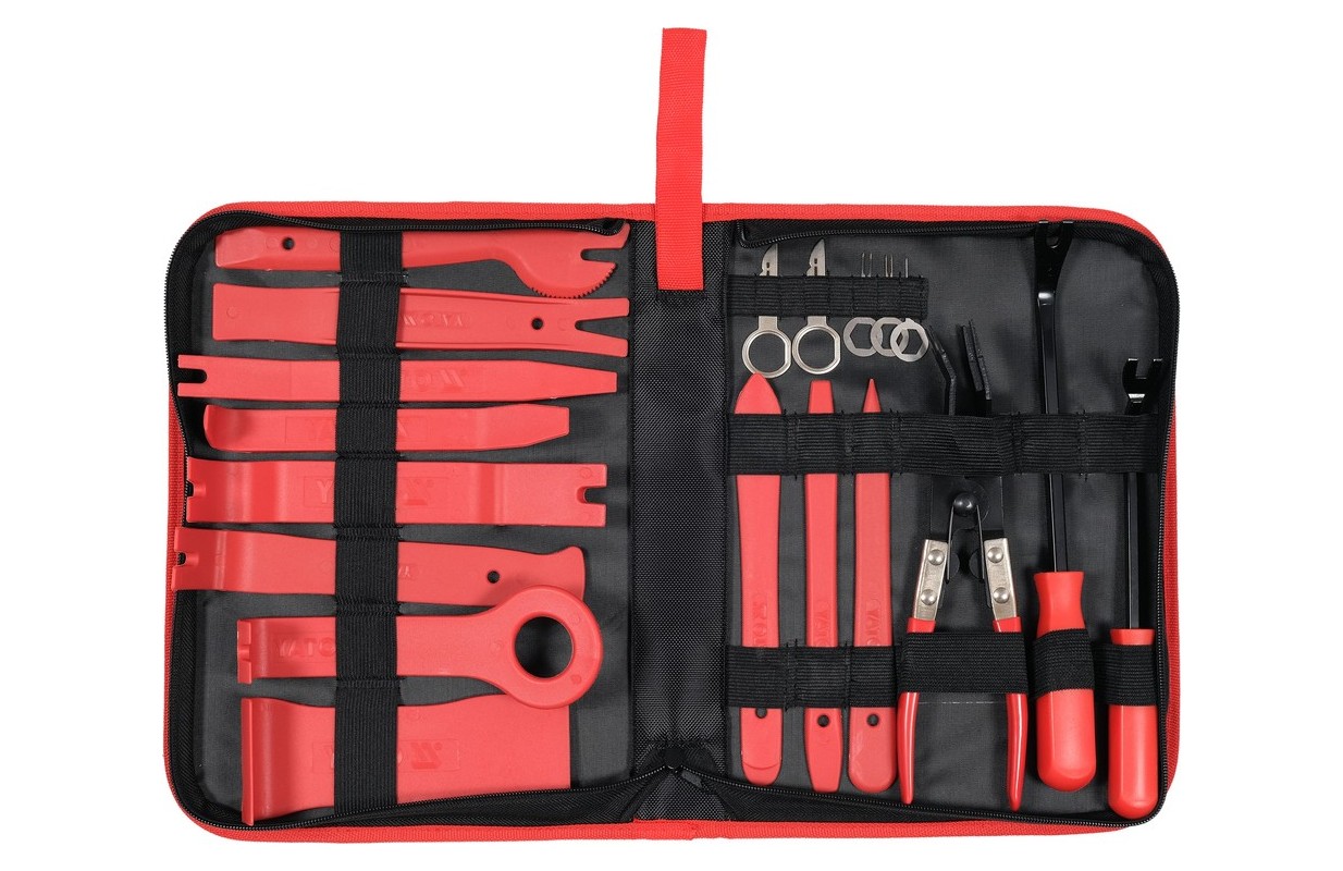 Профессиональный набор съемников для демонтажа автомобильной обивки, зажимов и планок. Также пригодится при снятии автомагнитолы, счетчика, электронного оборудования. Элементы изготовлены из прочного пластика, благодаря которому вы не сколете края обивки, когда будете ее поддевать. Набор рекомендуется для работы в автомобильной, обивочной, жестяной и малярной мастерской.