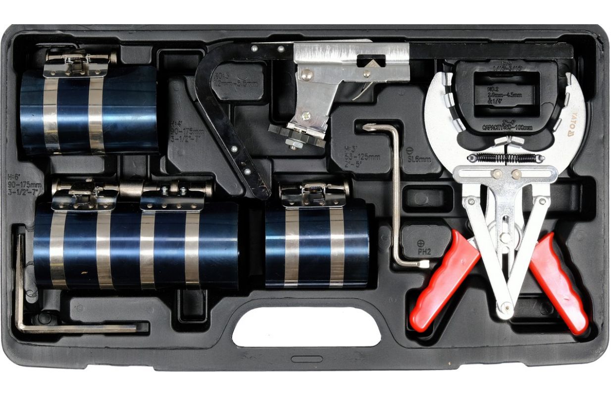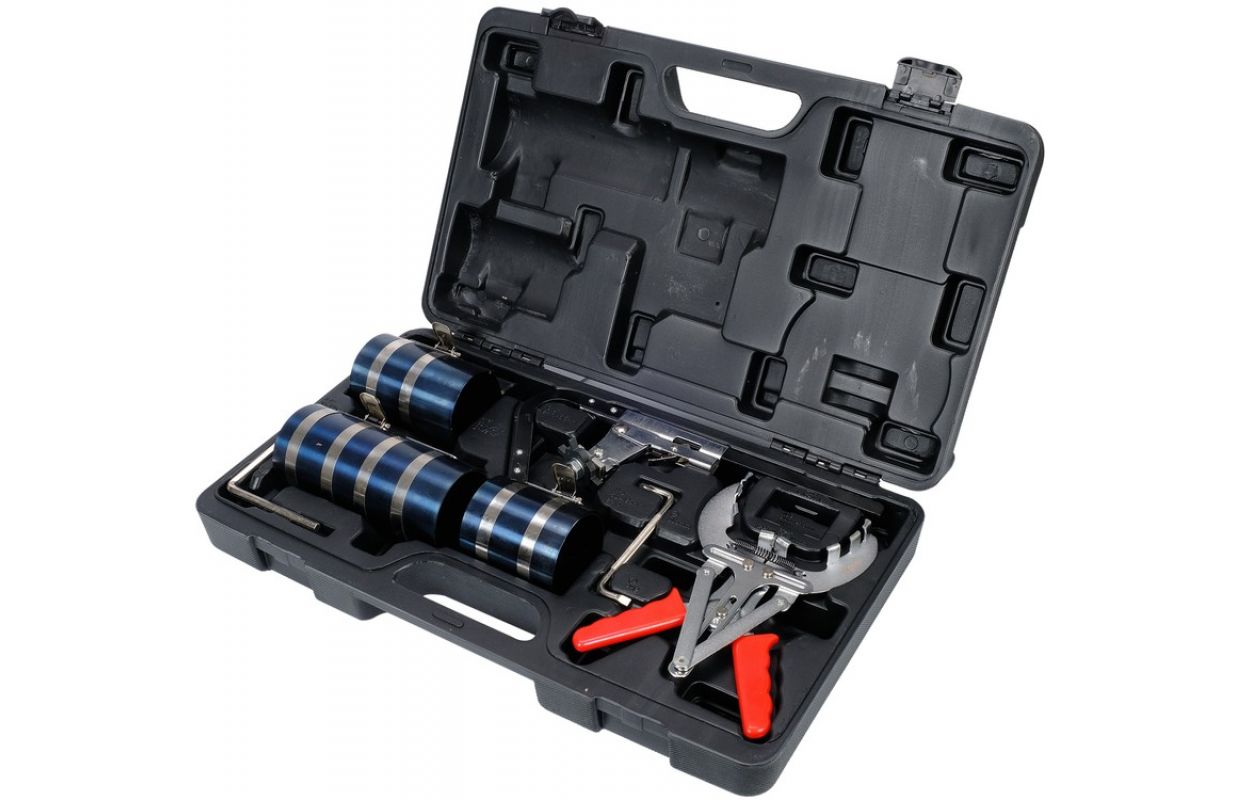 Кроме того, в комплект входят 3 зажима поршневых колец. Это необходимые инструменты для надежной посадки вооруженных поршней в цилиндр двигателя. Суппорты поддерживают следующие размеры поршней: 50-125 мм, 60-175 мм, 60-175 мм. Весь набор состоит из 10 элементов, упакованных в удобный чемоданчик.