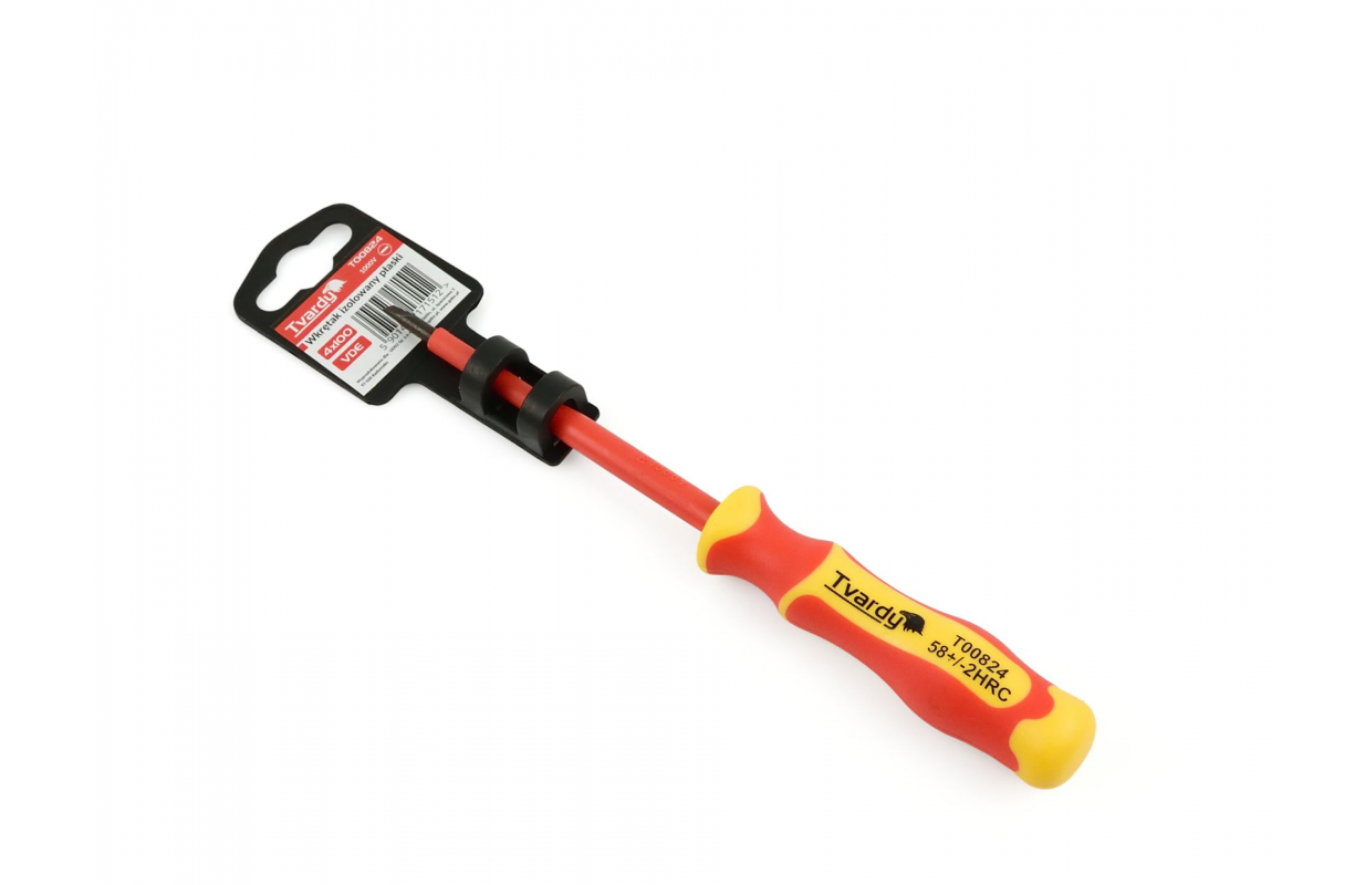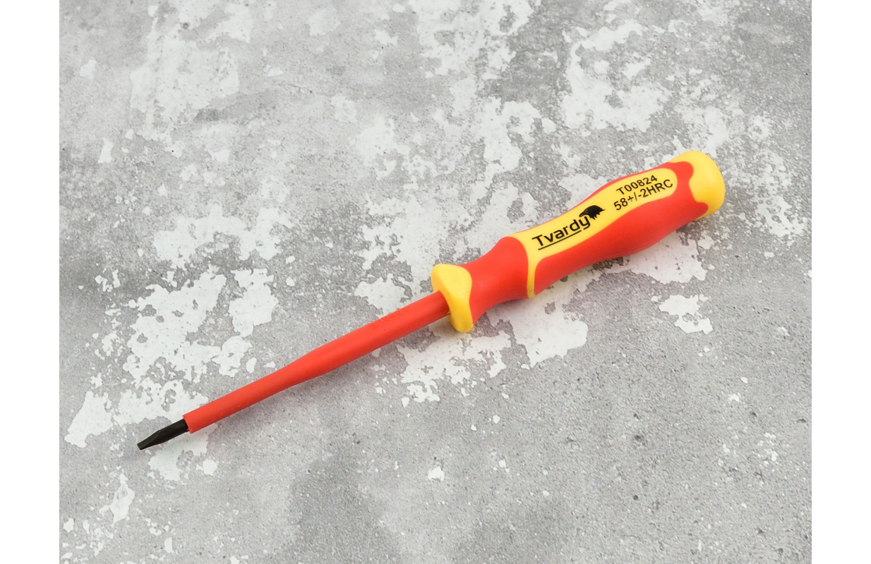 Профессиональная плоская отвертка с изоляцией VDE 4x100 мм , предназначенная для электриков. Эргономичная, многокомпонентная рукоятка обеспечивает эффективную изоляцию до 1000 В. Он отлично подойдет для всех видов работ на низковольтных установках. Наконечник отвертки изготовлен из высококачественной стали S2, подвергнутой соответствующей термической обработке с целью получения оптимальных параметров, твердость наконечника находится в пределах 56-60 HRC. Хвостовик шуруповерта изготовлен из стали CRV, которая отличается большей эластичностью.