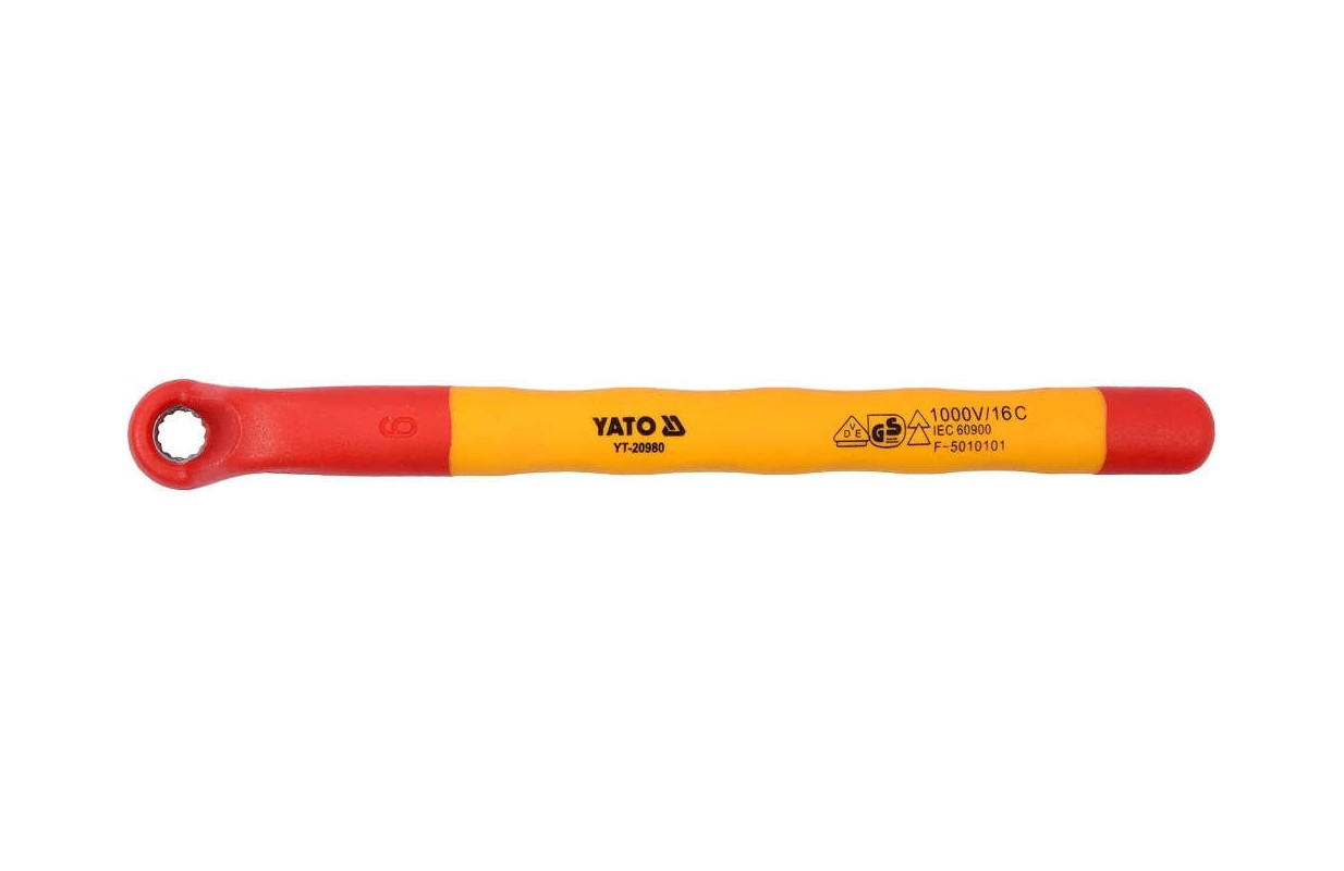 Изолированный изогнутый накидной ключ YT-20980 прошел испытания в лаборатории, аккредитованной немецким испытательным институтом VDE, и соответствует требованиям стандарта EN 60900.