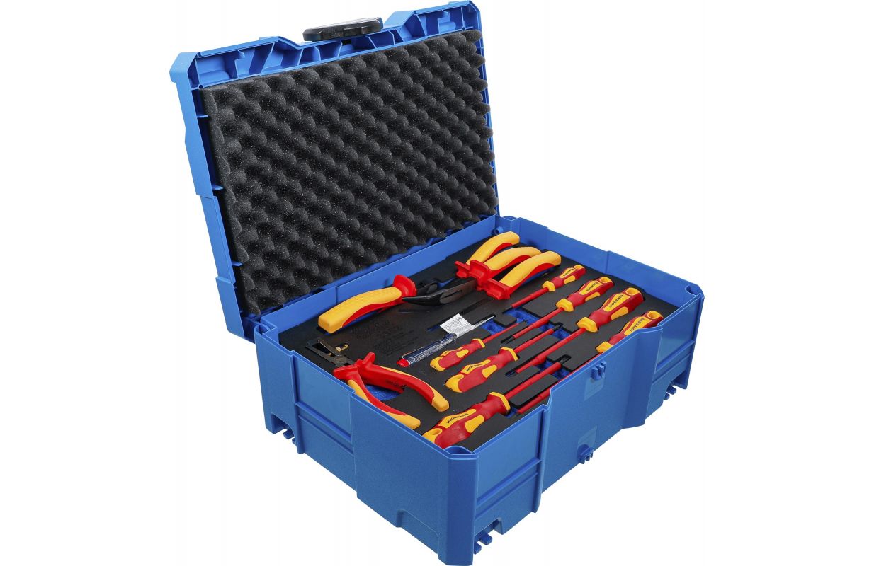 Описание Идеальная комбинация инструментов для использования в различных электроустановках или для ремонта и технического обслуживания гибридных и электрических транспортных средств оснащены изолированными инструментами и протестированы в соответствии с DIN EN/IEC 60900 С изоляцией VDE до 1000 В Интеллектуальная система транспортировки и хранения Управление одной рукой: закрытие, открытие и подключение к другим системам изготовлен из стабильного АБС-пластика функциональная ручка и застежка T-Loc Этот кейс является частью многокомпонентной системы, штабелируемой (контейнеры можно запирать друг на друга и переносить) Защитная набивка в верхней части крышки Внутренние размеры: ширина 383 мм | Высота 127,5 мм | глубина 267 мм Защита от брызг Лотки для инструментов из высокопрочной пены Инструменты защищены в лотке из твердого пенопласта и уложены в углубления нескользящим образом Каждому отдельному инструменту отведено свое место Материал: хромованадиевая сталь Комплект поставки: