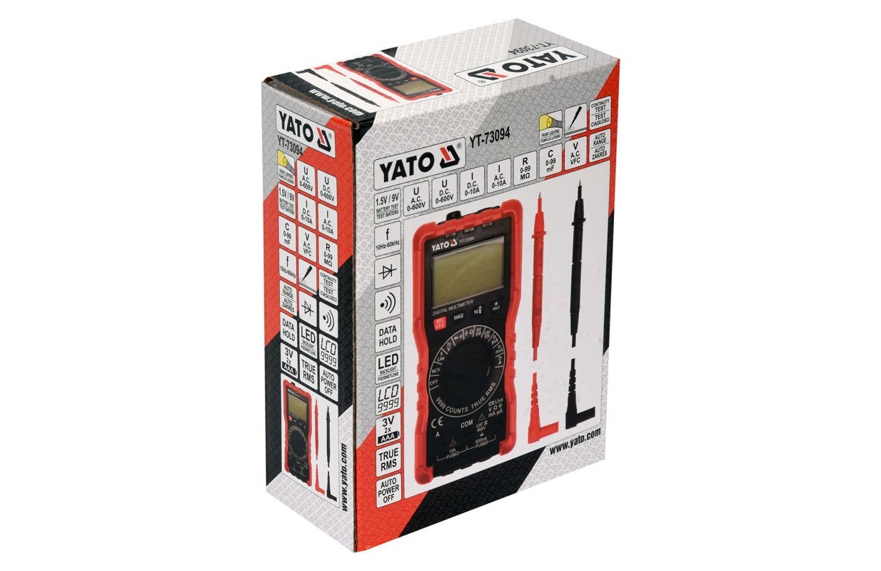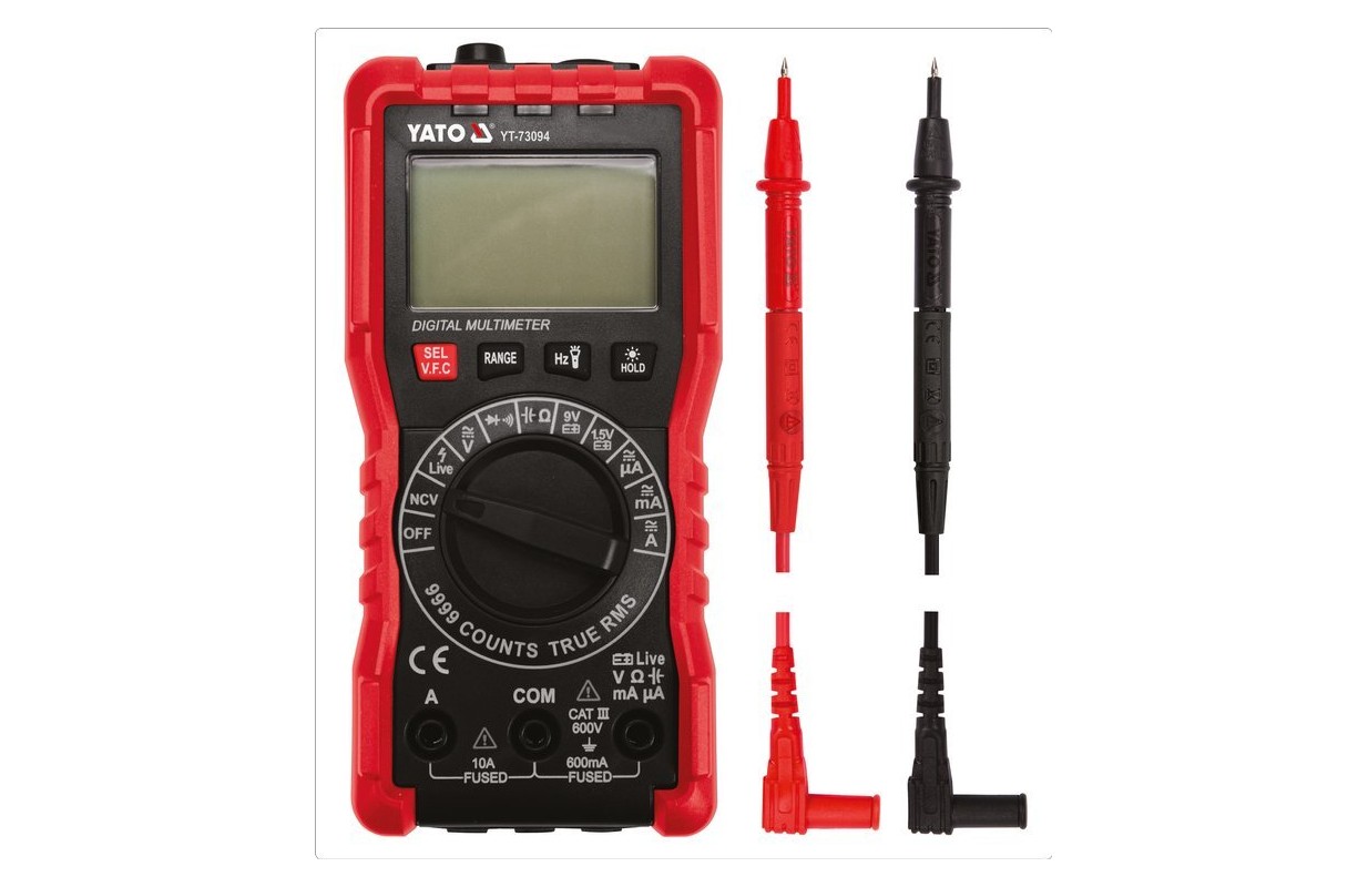 Электрический измеритель, предназначенный для измерения напряжения и тока, переменного и постоянного. Позволяет также измерять другие величины, в частности, сопротивление, емкость, а также контролировать работу светодиодов. Это особенно полезно при обнаружении неисправных компонентов электрооборудования. • автоматическая настройка диапазона измерения • измерение переменного напряжения: U a.c. 600 В (TRUE RMS) • измерение напряжения постоянного тока: U d.c. 600 В • измерение постоянного тока: I d.c. 600 мА, 10 А • измерение переменного тока: I а.c. 600 мА, 10 А • измерение напряжения переменной частоты • измерение сопротивления: R 9,99 MОм • измерение емкости: C 0-99,99 mF (автоматический диапазон) • измерение частоты: f 10 Гц – 60 кгц (автоматический диапазон) • тест диодов: UR = 3.3 В • тест непрерывности • тест батареи: 1.5 V, 9 В • частота выборки: 2-3 раза/сек. • защита от перегрузки • звуковой сигнал позволяет легко проверить непрерывность цепи • функция автоматического отключения • ЖК-дисплей с подсветкой с функцией сохранения измеренных значений • функция фонарика • индикатор низкого заряда батареи • резиновый корпус защищает мультиметр от механических повреждений • в комплекте: 2 тестовых провода