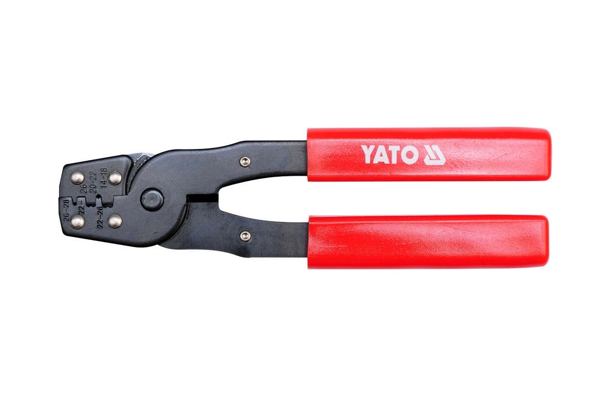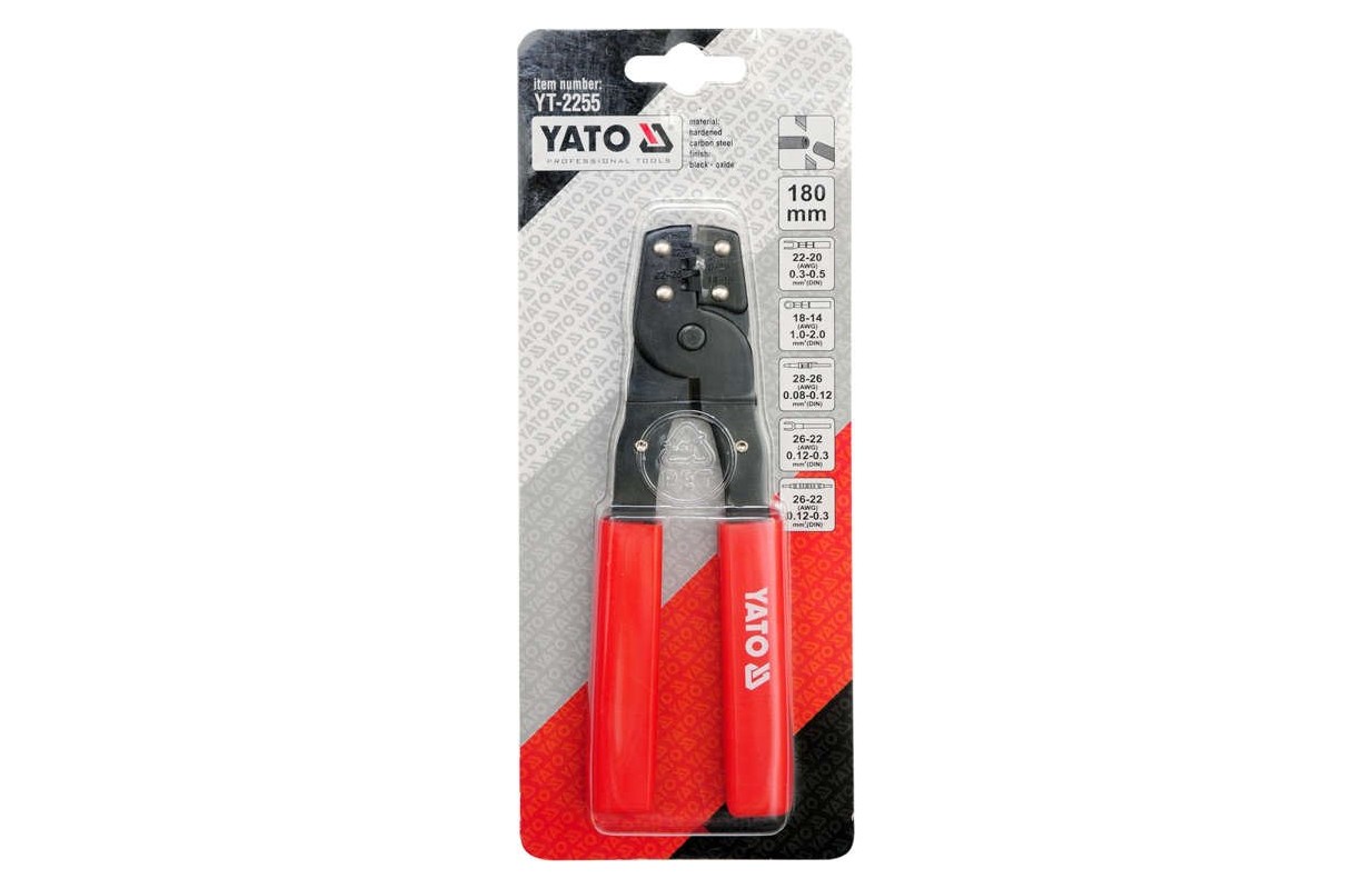 Клещи YT-2255 для обжима двух типов разъемов, с черненой поверхностью, защищающей от коррозии, и с пластиковыми накладками на рукоятках.