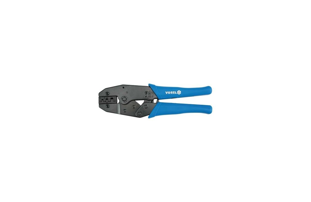 Клещи 45500 для опрессовки неизолированных разъемов, с черненой поверхностью, предохраняющей от коррозии, и с пластмассовыми ручками. Двухступенчатая форма губок облегчает первоначальную установку неизолированного соединителя в обжимной инструмент, а храповой механизм обеспечивает его точную и прочную фиксацию.
