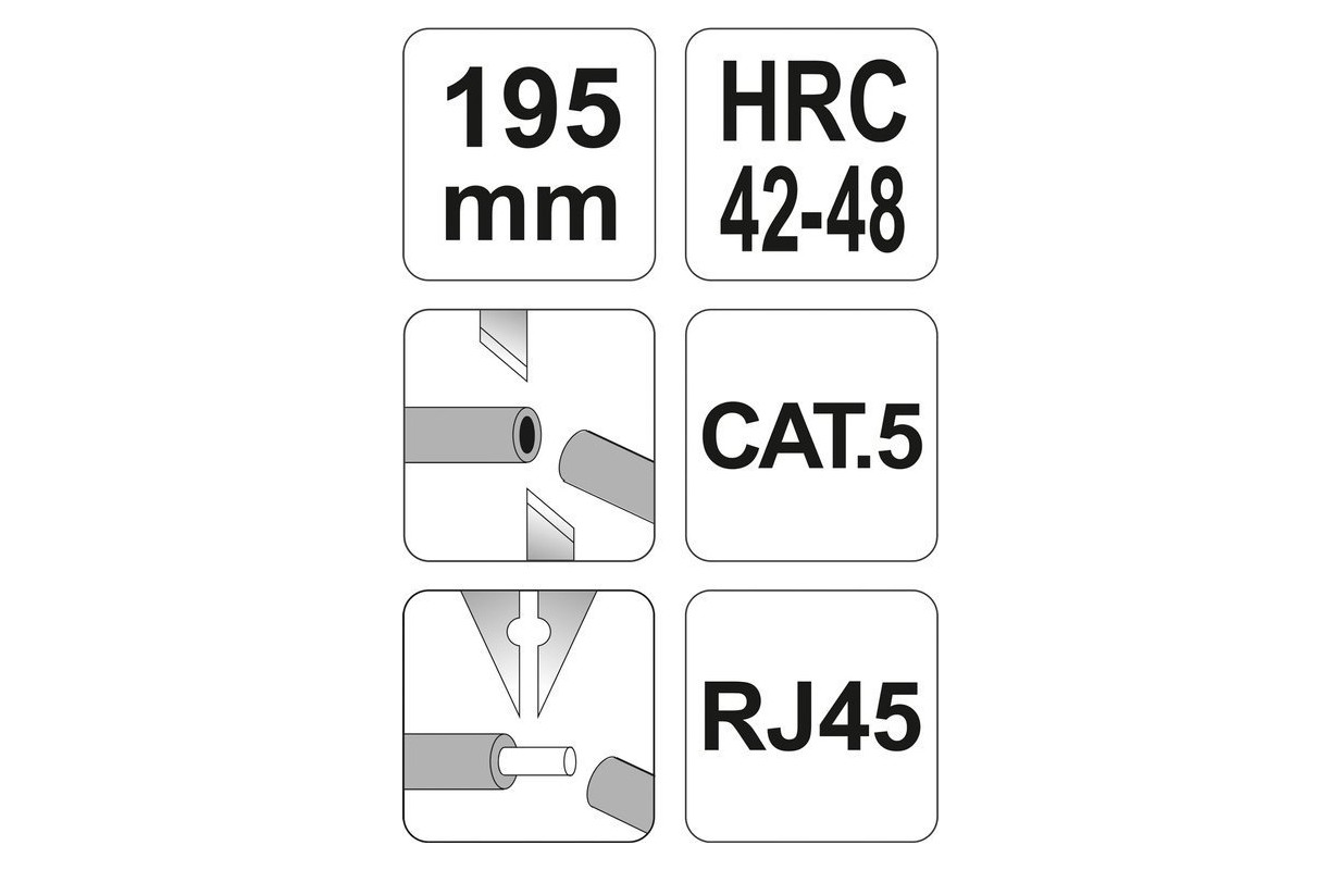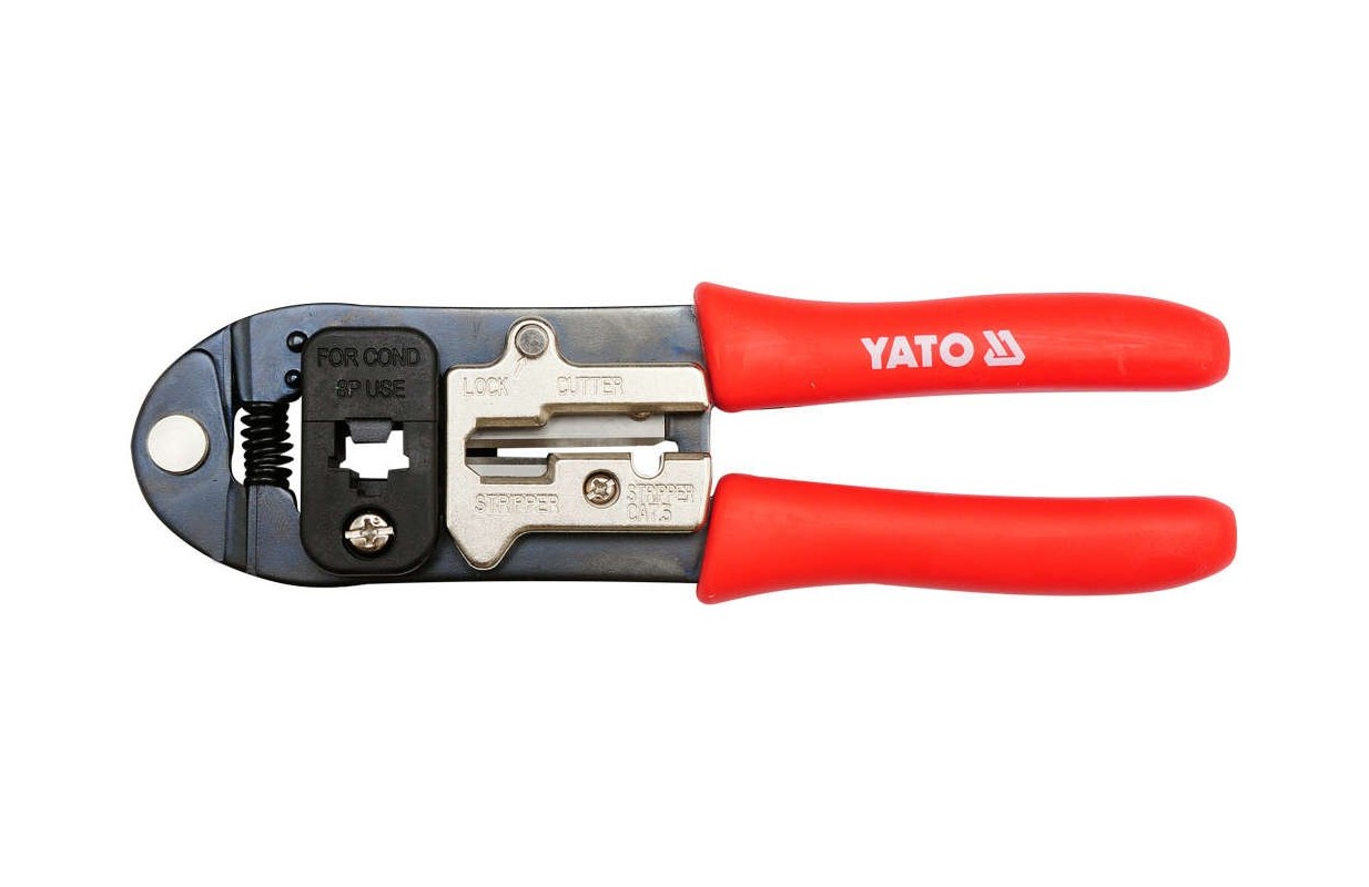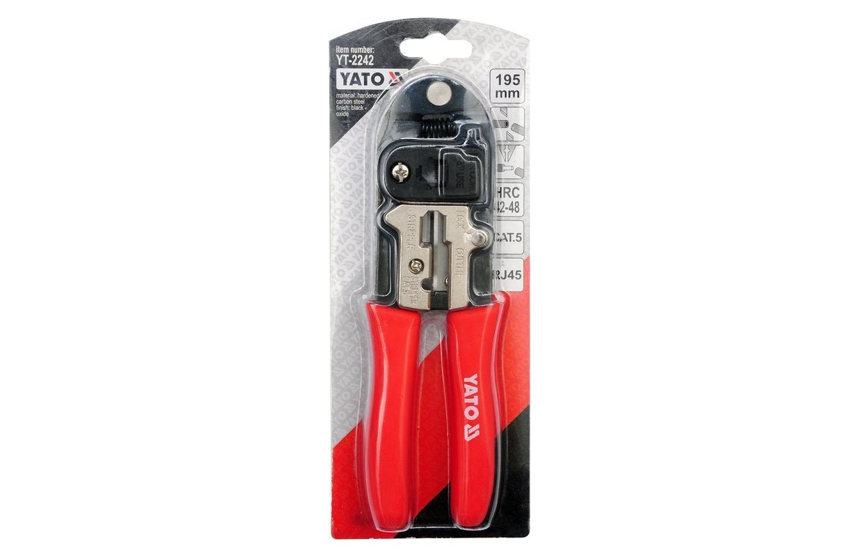 Клещи YT-2242 для обжима сетевых клемм, с черненой поверхностью, защищающей от коррозии, и с пластмассовыми крышками рукояток.