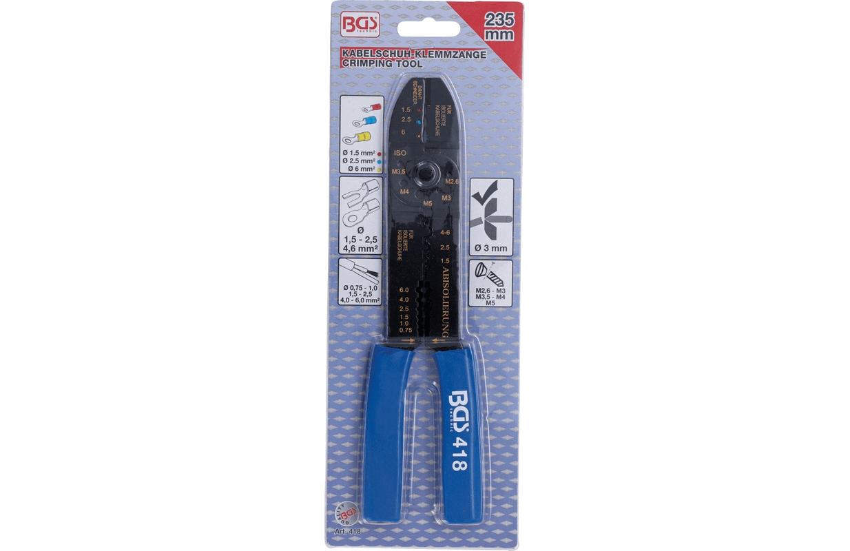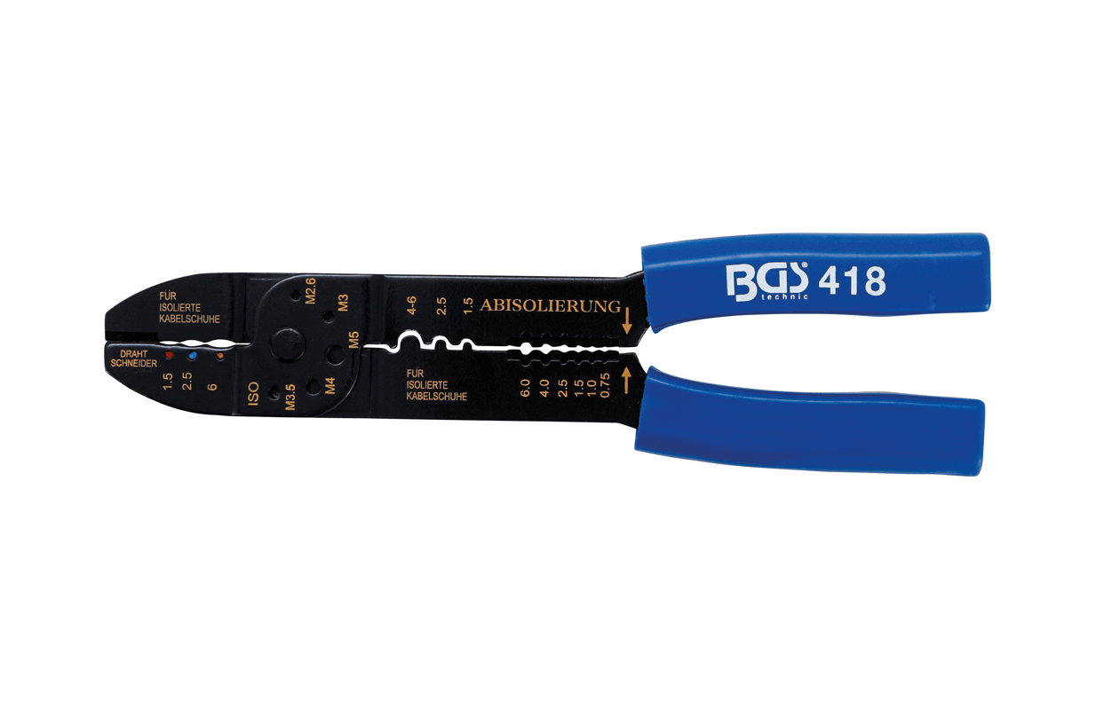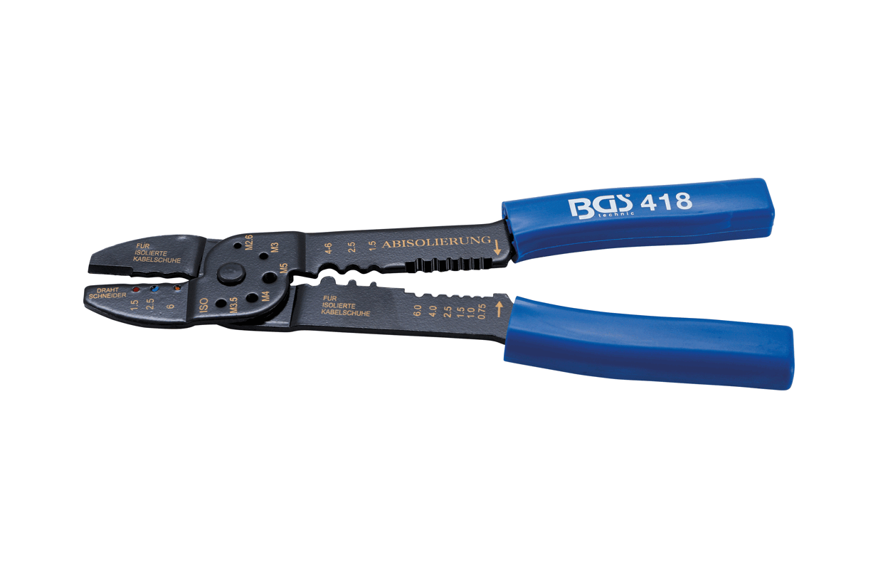 Описание с кусачками комбинированный инструмент для изолированных и неизолированных клемм мягкие синие ручки сталь толщиной 3 мм для неизолированных клемм размером 1,5 - 2,5 - 4,6 мм для размеров изолированных клемм: 1,5 мм (красный) - 2,5 мм (синий) - 6 мм (желтый) инструмент для зачистки проводов 0,75 - 1,0 - 1,5 - 2,5 - 4,0 - 6,0 мм Фреза для головок болтов M2,6 - M3 - M3,5 - M4- M5 Технические данные Упаковка подходит для настенного монтажа Да Длина 235 мм Вес брутто 270 г